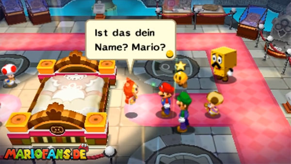 Im nächsten Raum steht ihr wieder vor einer Tür, die euch zu einem Shop führt. Kehrt zurück und hüpft zu eurer Rechten gegen den Ausrufezeichenblock, woraufhin ihr gegen ein paar Schlummbas antreten müsst. Während ihr diese auf die gleiche Weise angreift wie die Grumbas in der Wachwelt, müssen selbst erfahrene Mario-&-Luigi-Fans bei der Verteidigung beziehungsweise beim Kontern ein klein wenig umdenken: