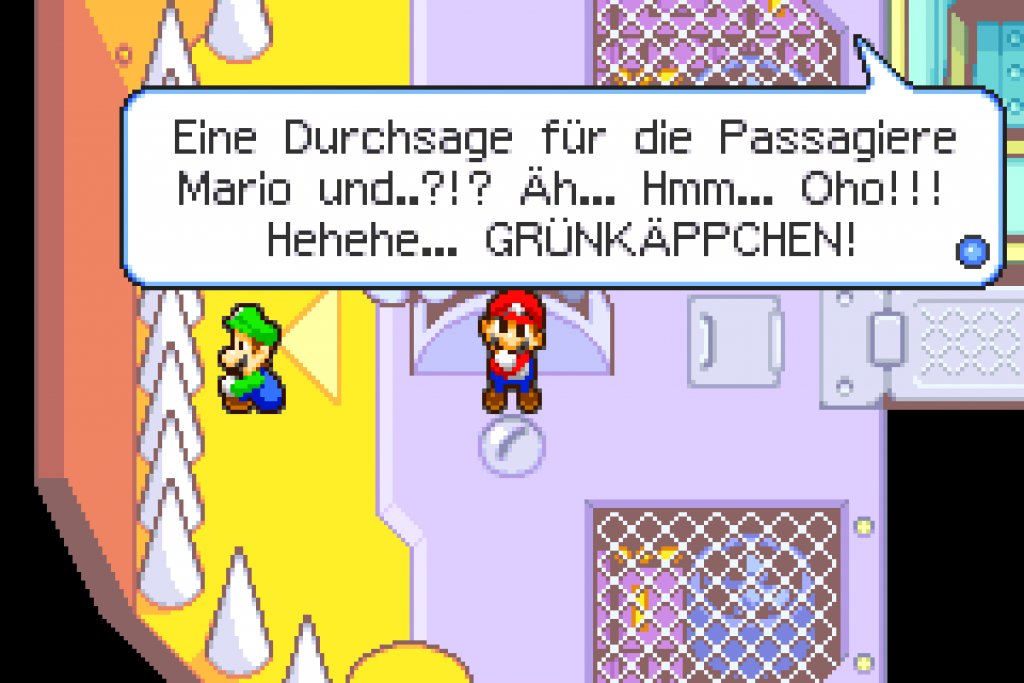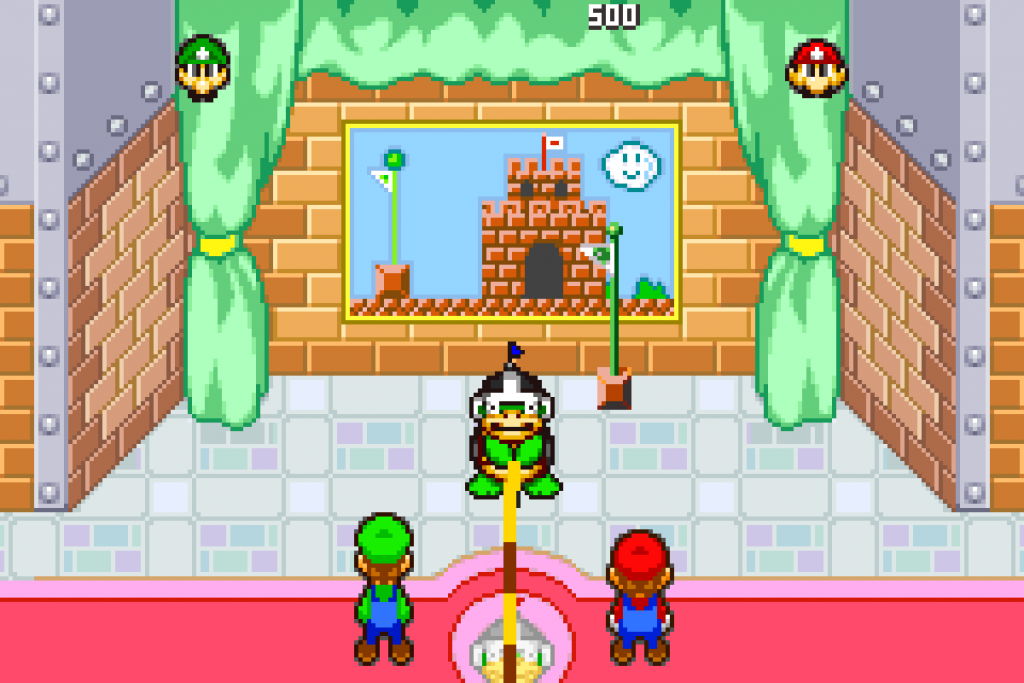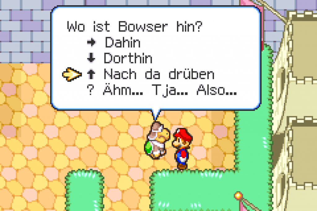 Ein Botschafter der Freundschaft betritt den Pilz-Palast. Doch leider führt dieser böses im Schilde und stiehlt der Prinzessin die Stimme. Kurz darauf kannst du einen Toad steuern. Suche in der Dusche nach Mario, damit dieser mit Luigi im Schlepptau zum Schloss gelangt. Kaum angekommen, kommt es auch schon zum Kampf gegen Bowser. Dieser ist aber nach wenigen Treffern beendet. Suche nun im Schlossgarten nach einigen Items, wie z.B. nach dem Dings von einem Toad, welches sich im Süden von der linken Hecke befindet oder weise einem Koopa den Weg Richtung Norden zum Koopa-Jet. Hast du alles erledigt, speichere das Spiel einmal und du erhältst kurz vor dem Treffpunkt einen Koffer. Kurz darauf kommt es wieder zu einer witzigen Zwischensequenz und Mario und Grünkäppchen befinden sich an Board vom Koopa-Jet.