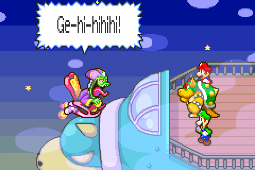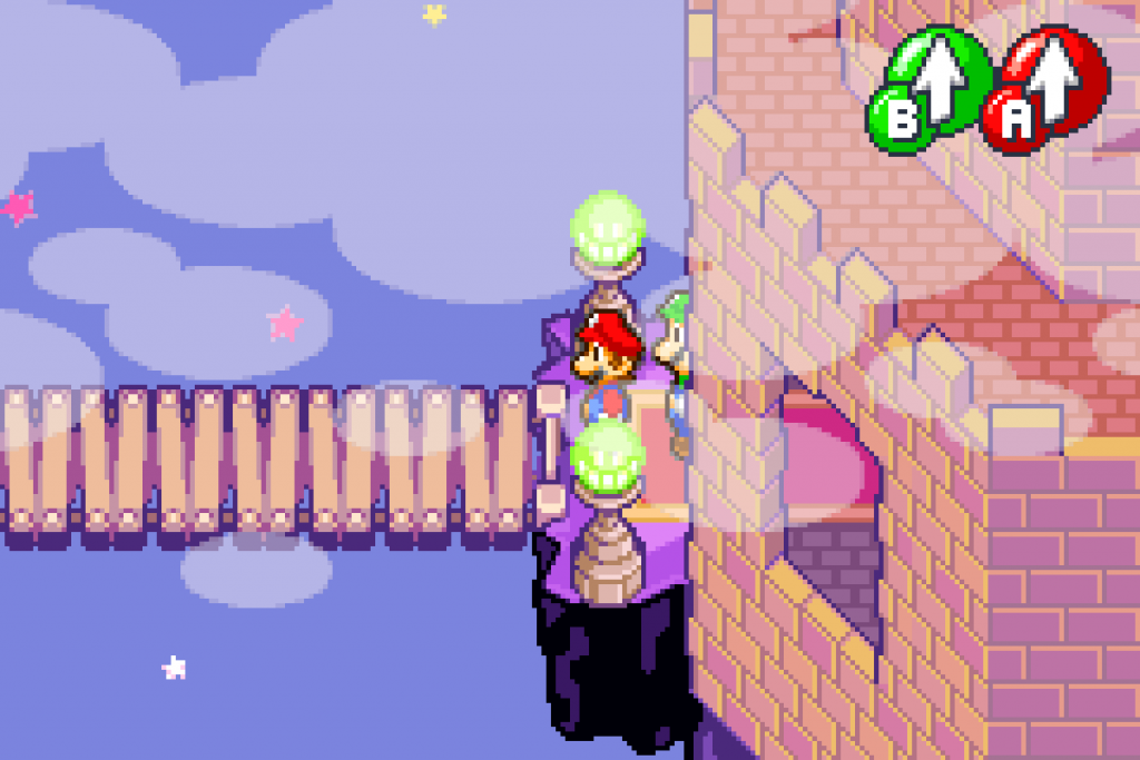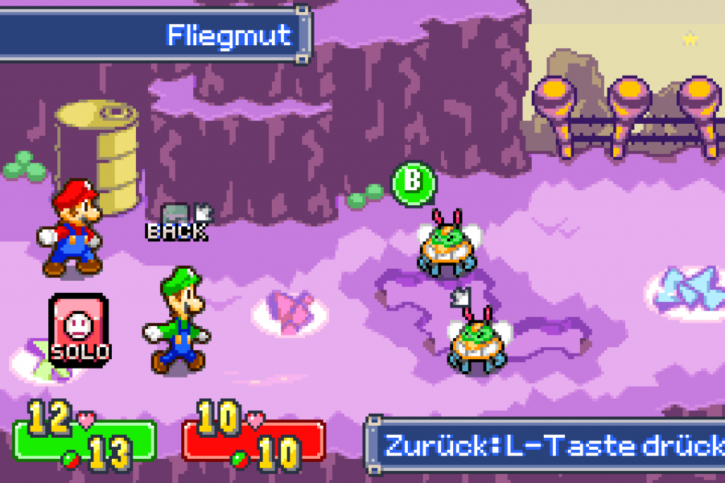 Hast du dies geschafft, überreicht dir der eine Typ die Karte vom Bohnenland. Im Anschluss gehst du noch in die Röhre und aktivierst den ersten Warp-Punkt. Nun musst du noch die „Grenze“ überwinden, d.h. du springst mit Mario & Luigi gleichzeitig (A + B zusammen drücken) über die Stacheln. Unterwegs triffst du auch auf neue Gegner, den Fliegmuts. Übe an diesen nocheinmal die Angriffe, bevor es am Ende links über die Brücke geht, wo du Bowser in einer Kanone findest. Der Bösewicht Stella fordert für seine Freigabe 100 Münzen, welche du nun suchen musst.
