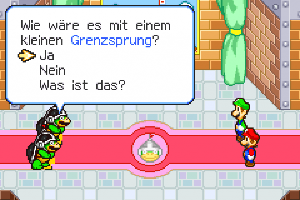 Folge nun dem Weg und sammle unterwegs die Blöcke ein. Ein Koopa bemerkt, dass du gar kein Bild in deinem Reisepass hast, also wird kurzerhand eins vor Ort erstellt. Bewegst du dich während der Aufnahme, schneidest du eine Grimasse. Mit den fertigen Pässen geht es weiter. Unten kannst du bei den Kisten den Koopa finden, dem du vorher den Weg gewiesen hast, dieser schenkt dir einen 1-Up-Pilz. Ist auch dies gemeistert, kommt es zum Kampf als Paar. An ein paar Gumbas wird dies nun geübt. Am Ende des Lagerraumes musst du einen Schalter aktivieren, damit der Greifarm sich Luigi schnappt und dieser Ausschau halten kann. Nach einigen Sequenzen folgt der Kampf gegen Krankfried. Bowser gibt dir noch etliche Tipps, wie du seinen Angriffen am besten ausweichst. Nach gut 10 Runden sollte er aber besiegt sein.