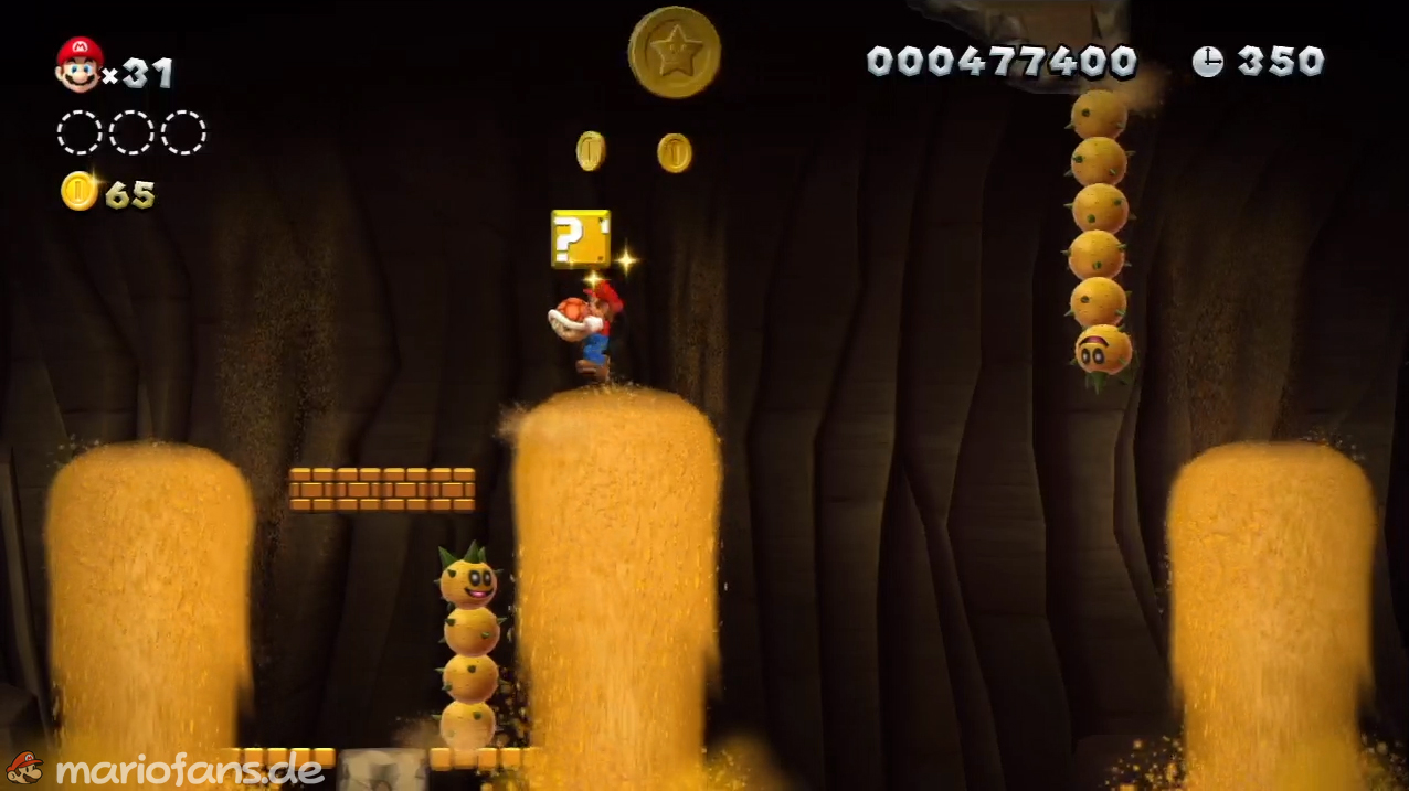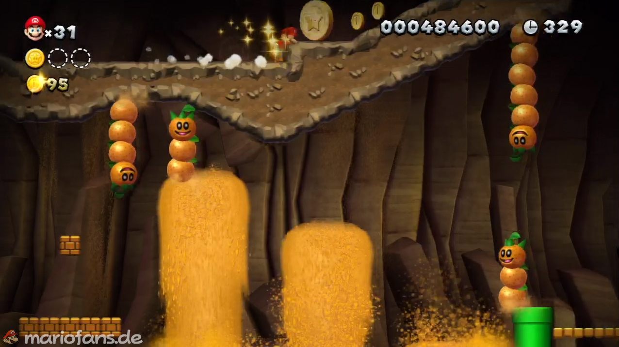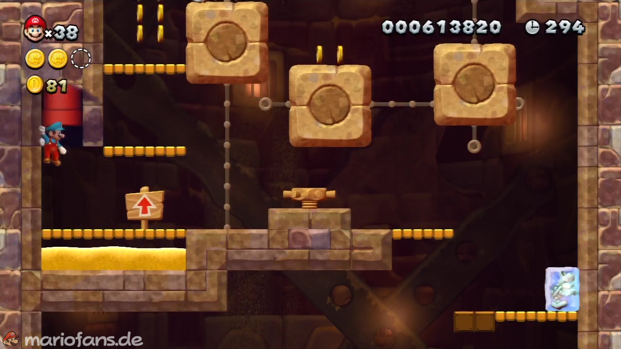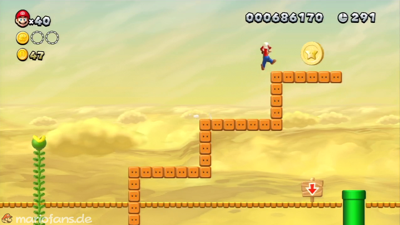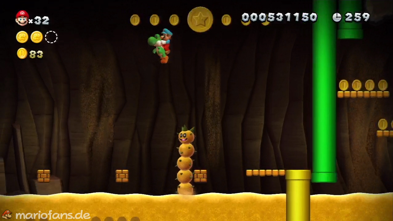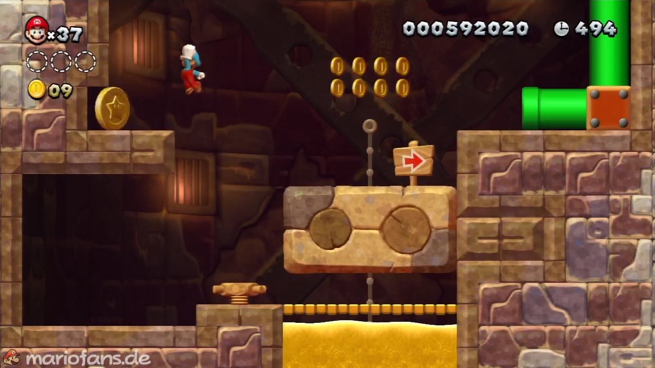 Nach der Fahne, dort wo auf dem Schild der Pfeil nach rechts oben zeigt, kannst du durch die Steinplattform gehen. Du findest ein Rohr, welches dich zur Sternenmünze führt. Sei aber vorsichtig, nicth dass du durch die Sandstrahlen wieder hinaus befördert wirst.
