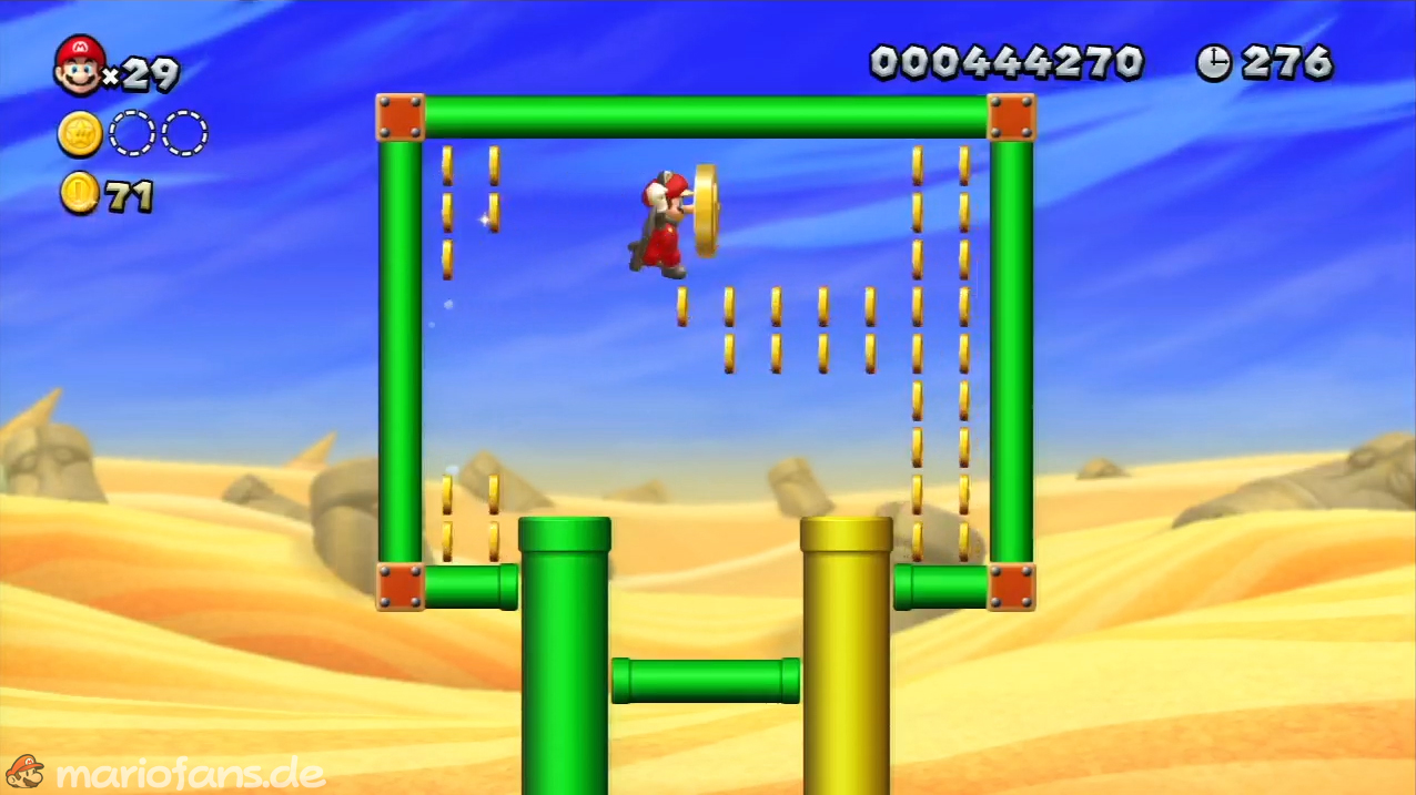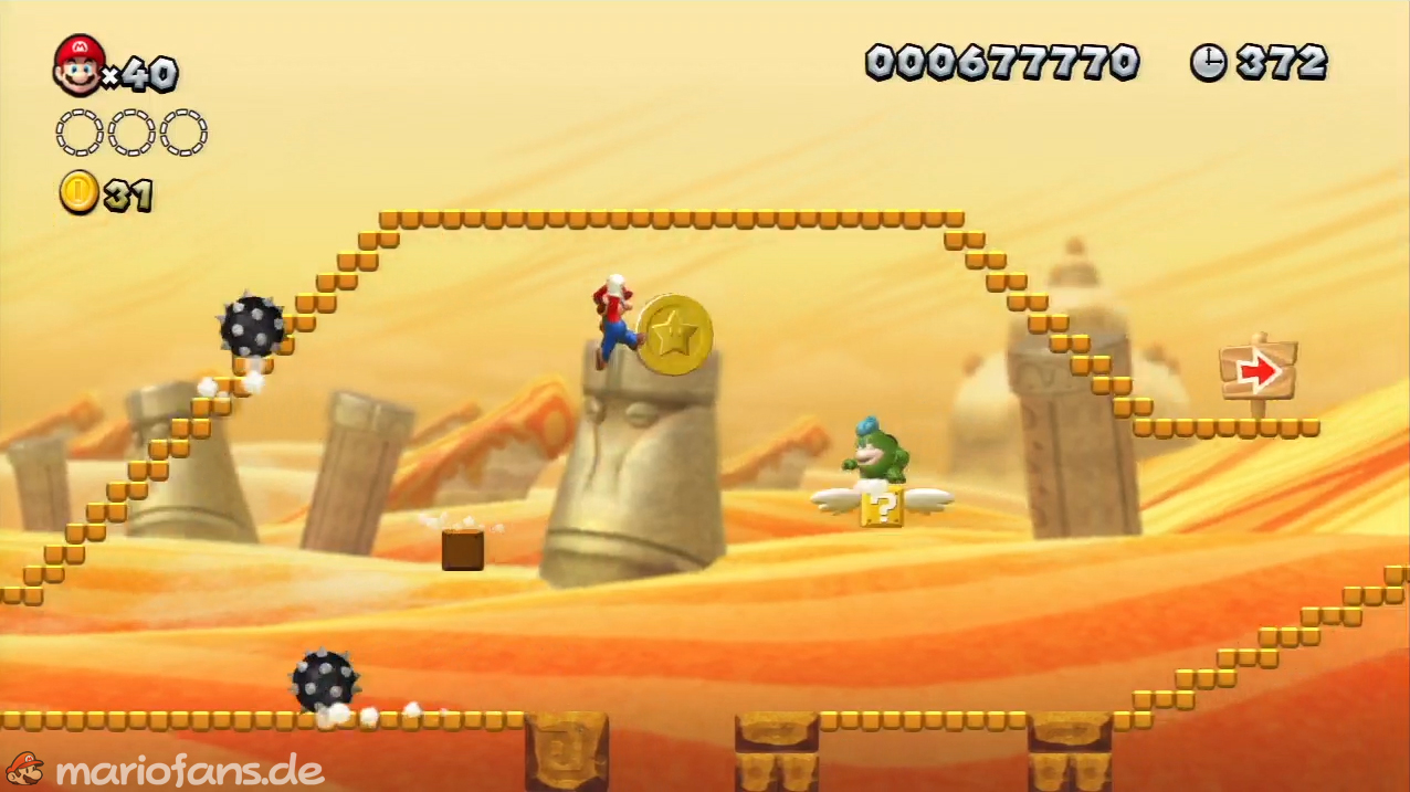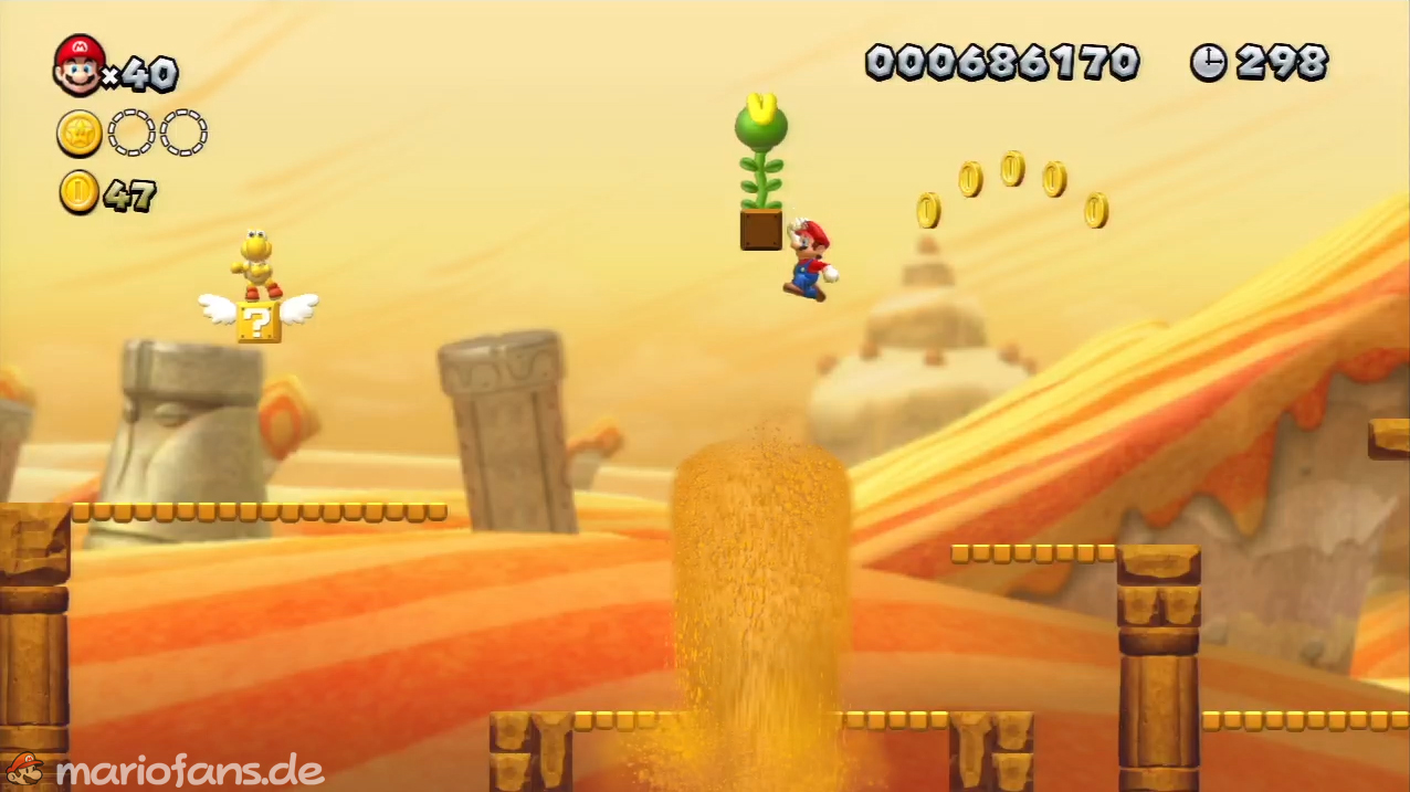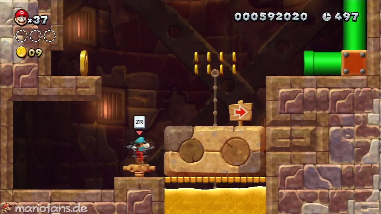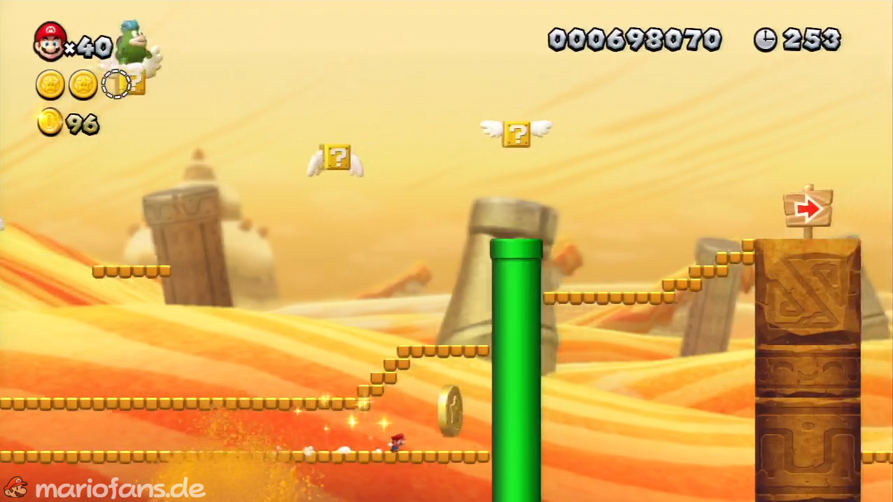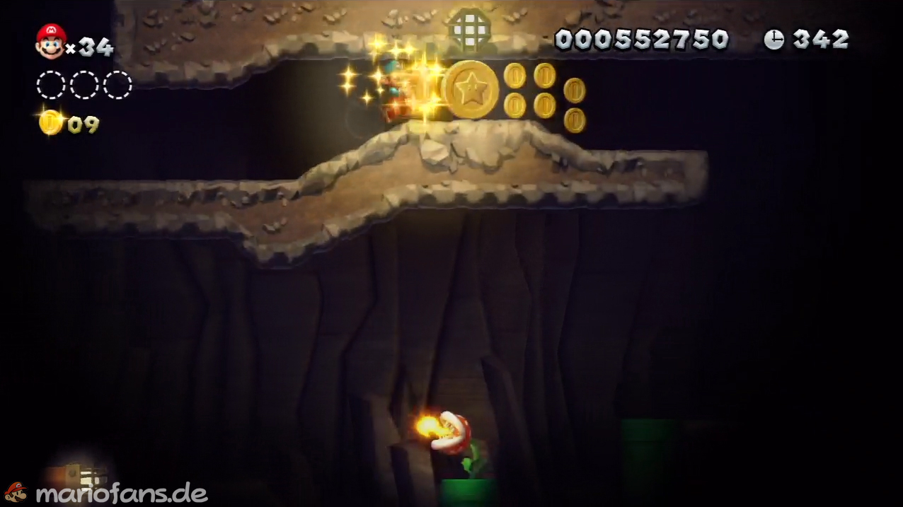 Nach der Fahne, dort wo auf dem Schild der Pfeil nach rechts oben zeigt, kannst du durch die Steinplattform gehen. Du findest ein Rohr, welches dich zur Sternenmünze führt. Sei aber vorsichtig, nicth dass du durch die Sandstrahlen wieder hinaus befördert wirst.