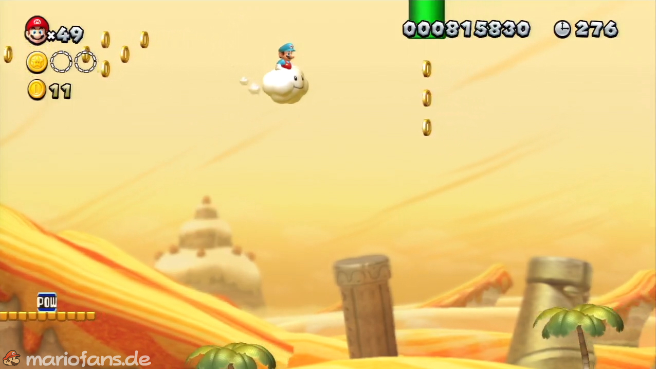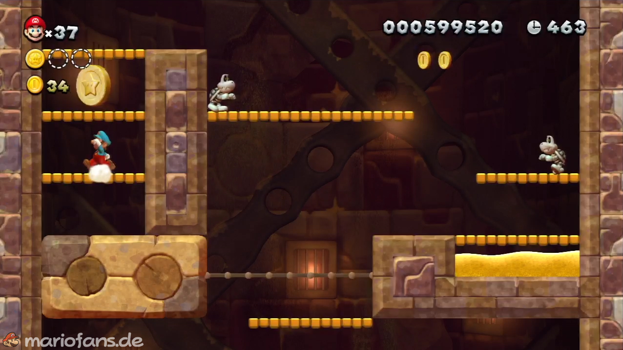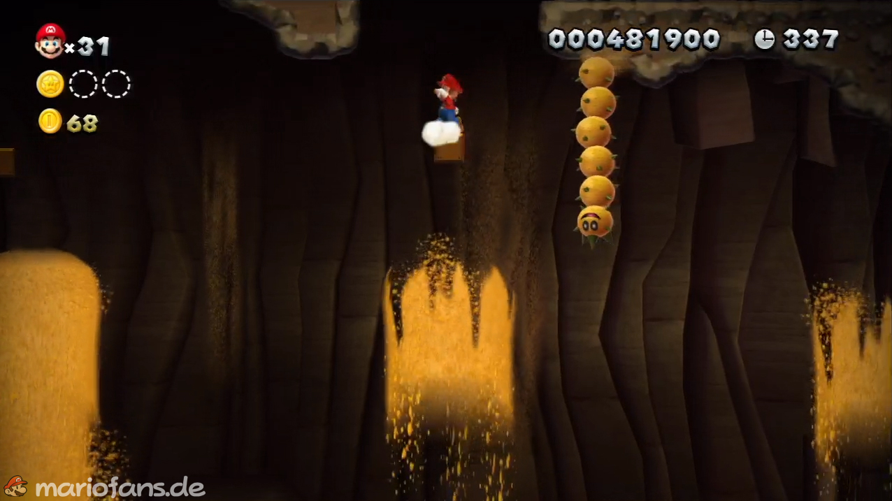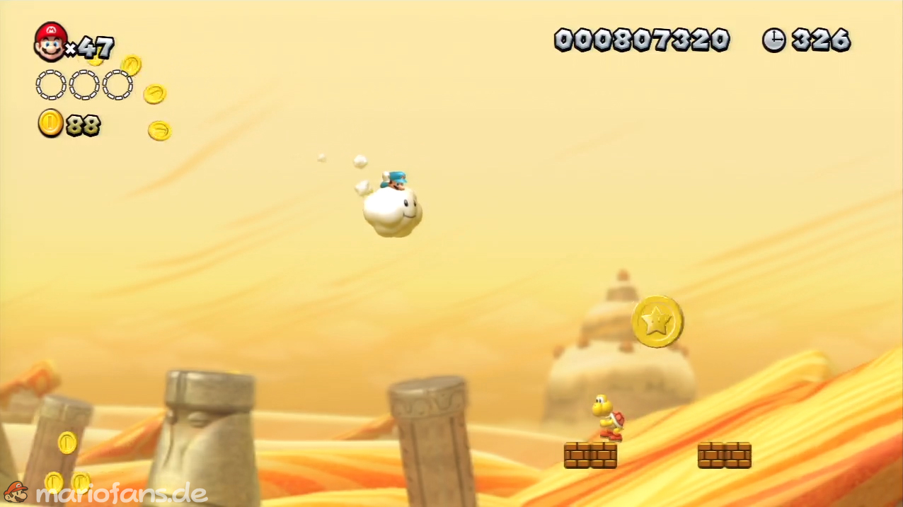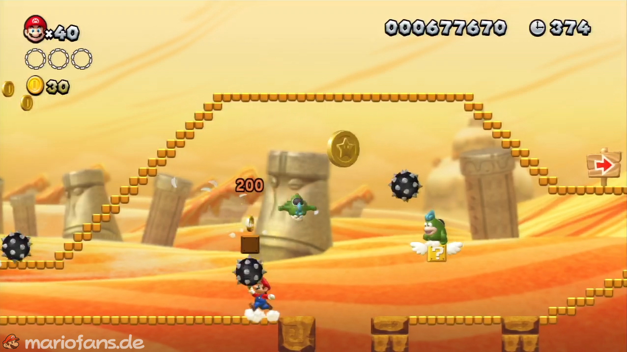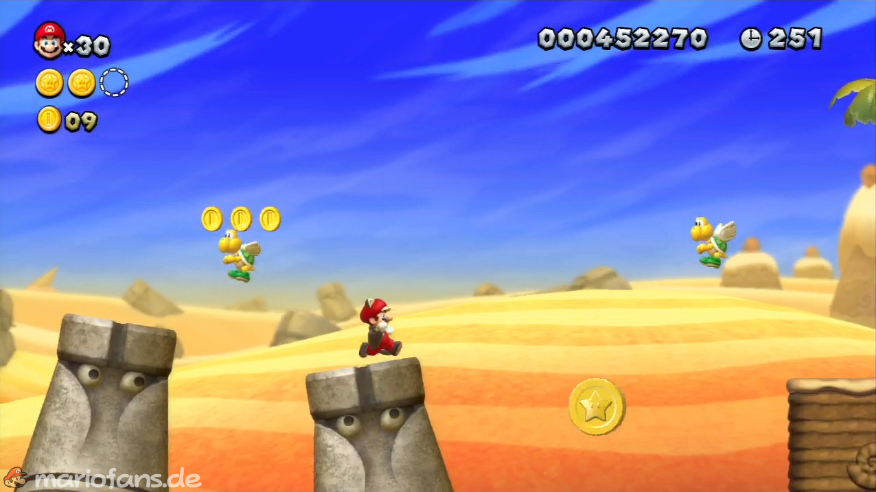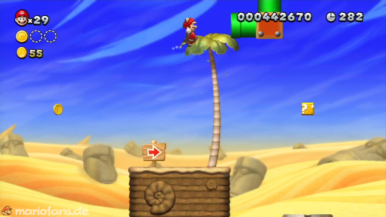Nach der Fahne, dort wo auf dem Schild der Pfeil nach rechts oben zeigt, kannst du durch die Steinplattform gehen. Du findest ein Rohr, welches dich zur Sternenmünze führt. Sei aber vorsichtig, nicth dass du durch die Sandstrahlen wieder hinaus befördert wirst.