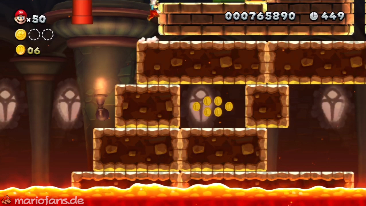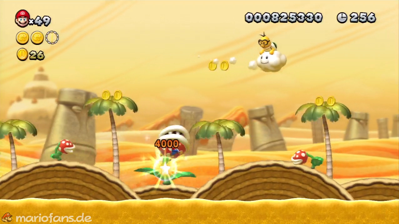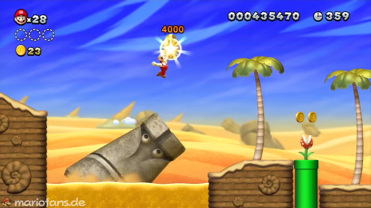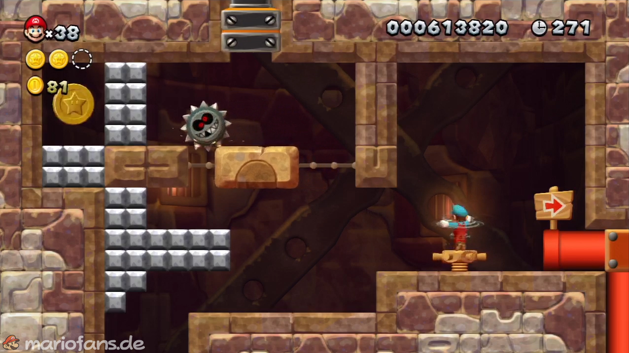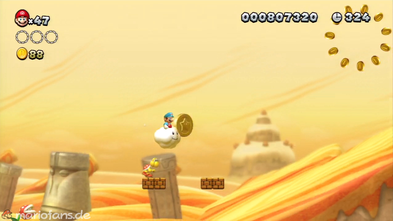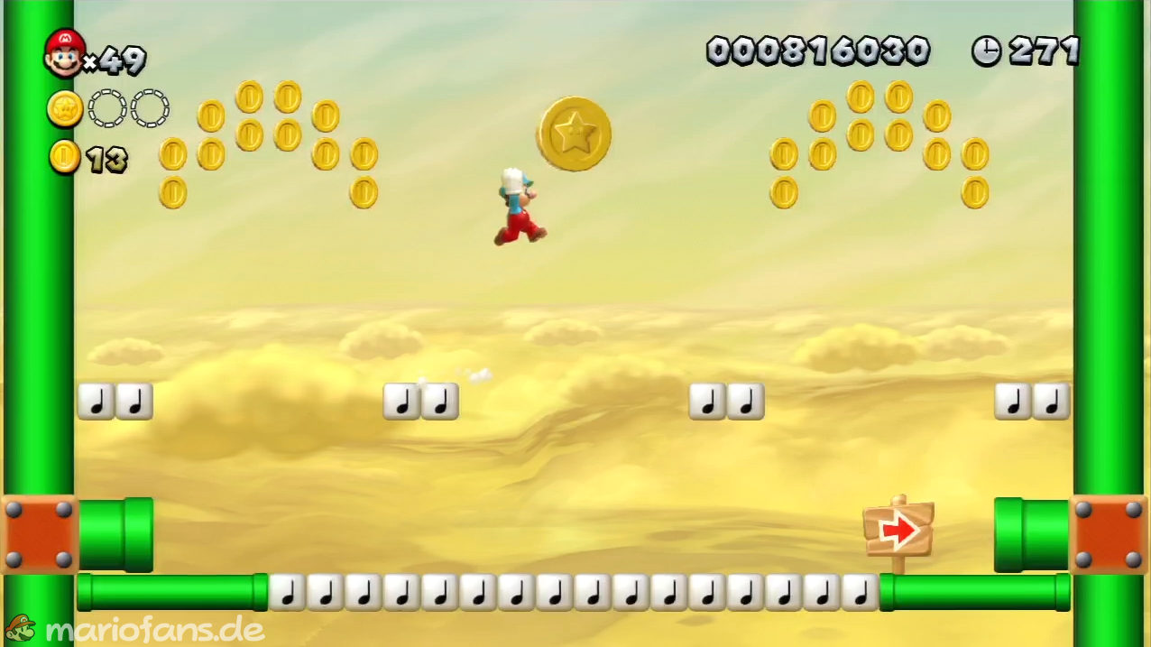 Nach der Fahne, dort wo auf dem Schild der Pfeil nach rechts oben zeigt, kannst du durch die Steinplattform gehen. Du findest ein Rohr, welches dich zur Sternenmünze führt. Sei aber vorsichtig, nicth dass du durch die Sandstrahlen wieder hinaus befördert wirst.