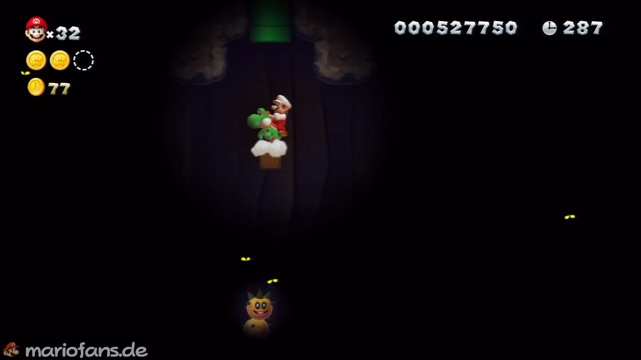 Nach der Fahne holst du dir den Yoshi und gelangst über eine Röhre in einen weiteren Abschnitt. Suche hier an der Decke eine grüne Röhre. Um sie zu erreichen springst du mit Yoshi auf einen Pokey. Im neuen Abschnitt schwebt die Sternenmünze weit oben. Spring wieder auf einen Pokey um sie dir zu schnappen.