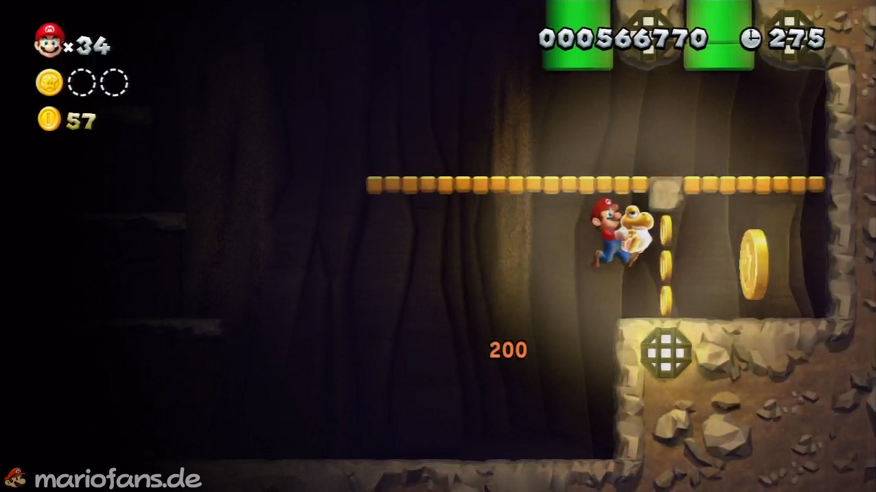 Bei der roten Röhre springst du rechts die Plattform nach oben und kommst zu einer grünen Röhre. Mit einem Wandsprung gelangst du zur Sternenmünze. - Sternenmünze 3