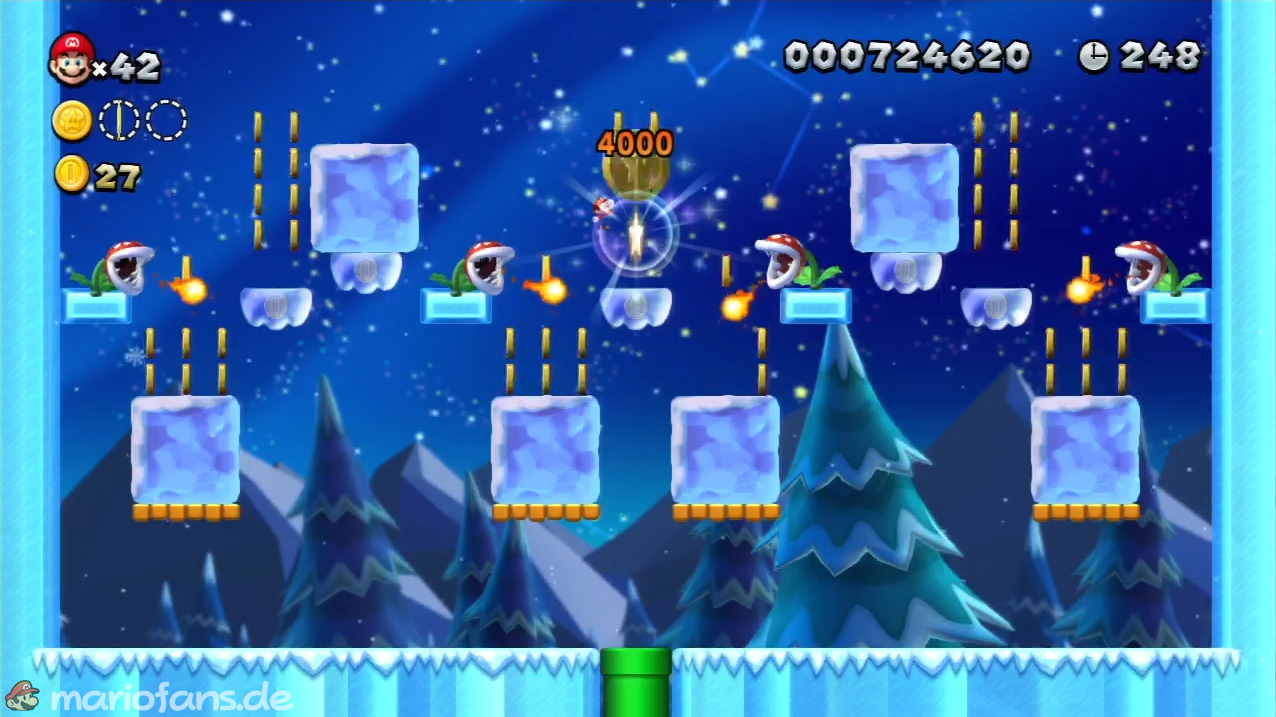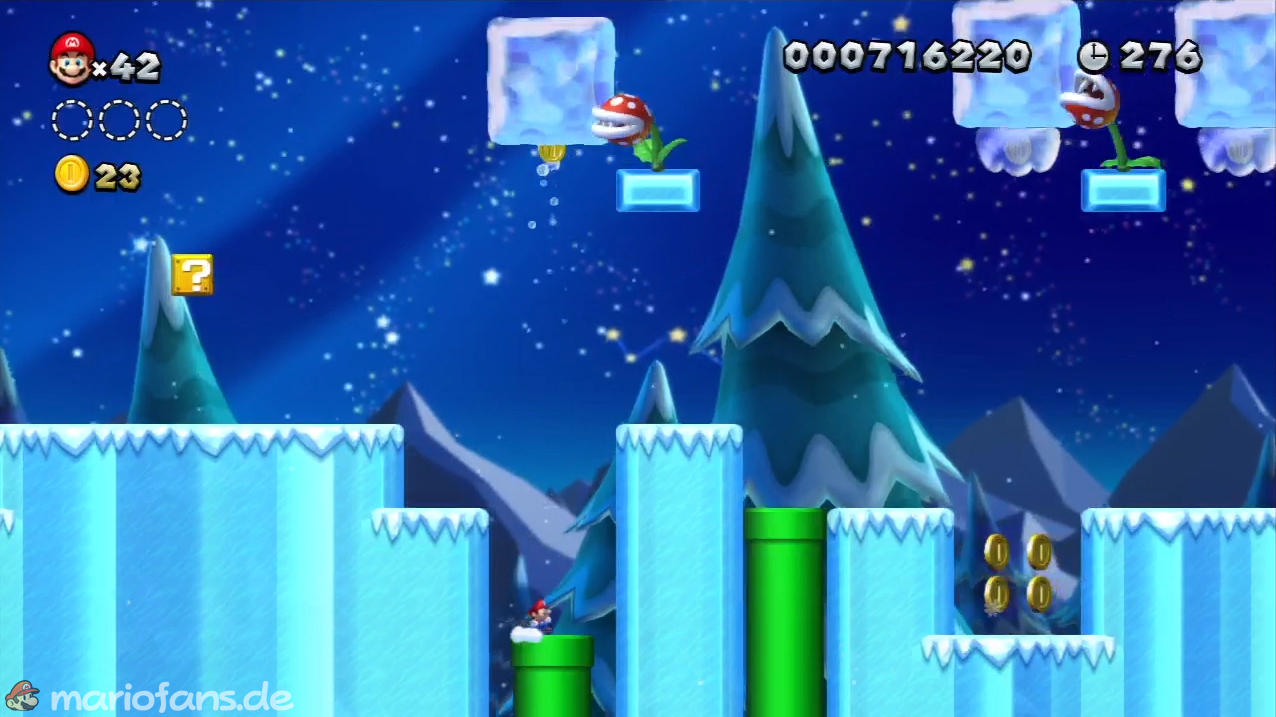 Laufe ziemlich weit in das Level hinein, bis du zu ersten Röhre kommst. Spring schnell hinein, bevor eine Piranha-Pflanze den Zugang mit einem Eisblock verpserrt. Bis du schnell genug, erhältst du die erste Sternenmünze. - Sternenmünze 2