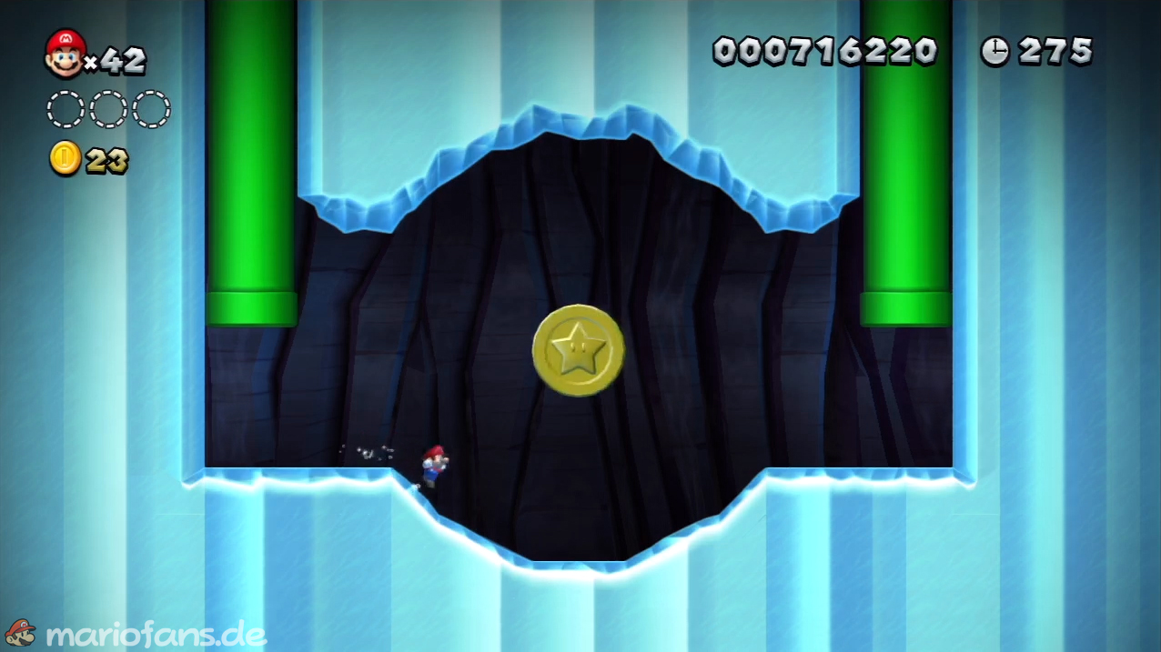 Kurz nach dem grünen Ring findest du rechts zwei Eisblöcke. Springe mit einem Wandsprung an diesen nach oben und du erreichst die nächste Röhre. Im neuen Abschnitt musst du kurz warten, bis die ersten beiden Eisblöcke runtergefallen sind und du kannst die Sternenmünze aufsammeln. - Sternenmünze 3