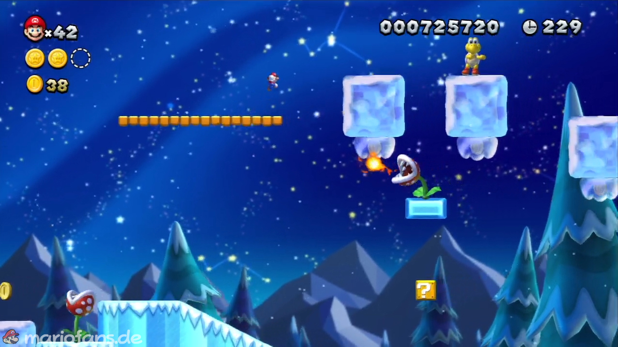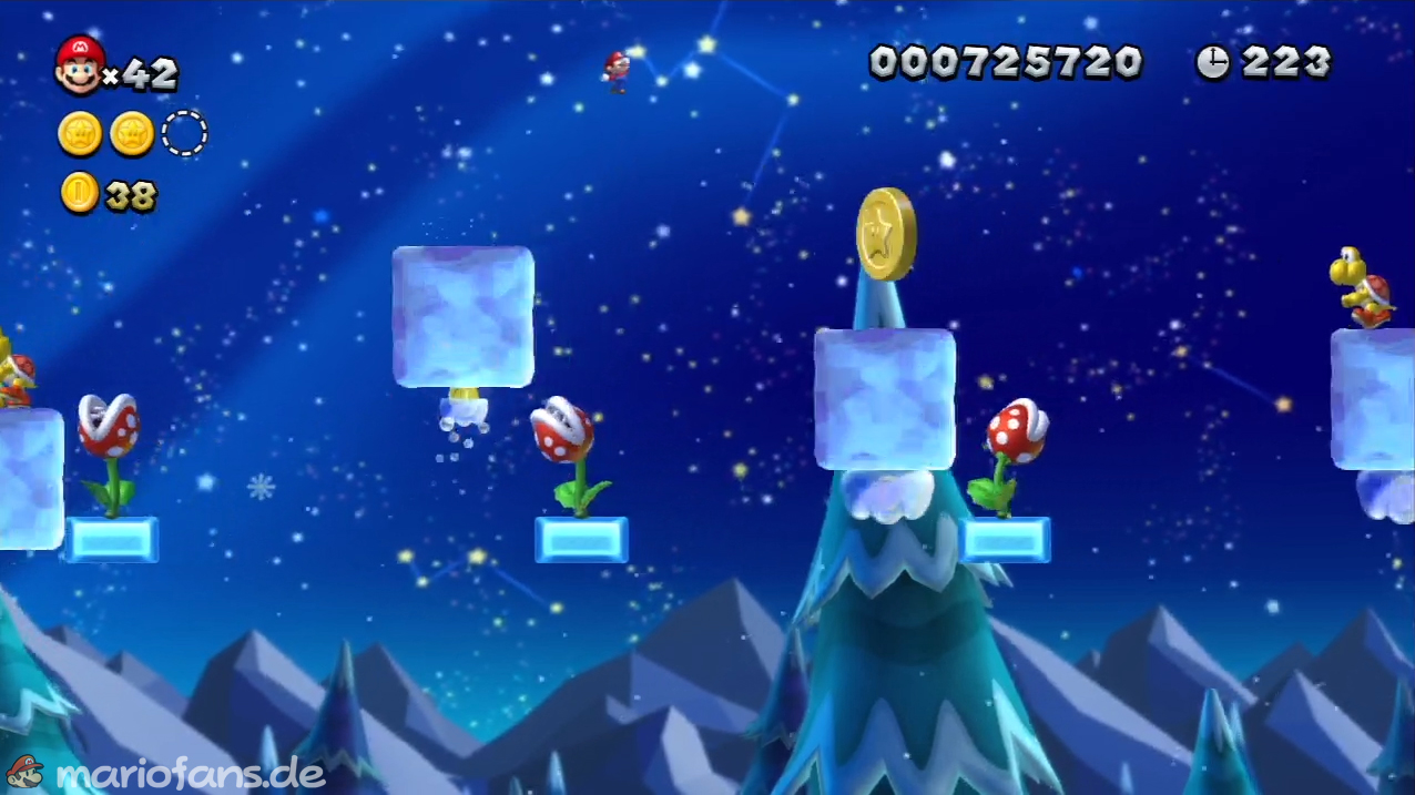 Laufe kurz darauf auf den ganzen Eisblöcken bis zum Ende. Spring dann nach oben, so dass du auf einer weiteren Plattform landest. Laufe hier oben weiter auf den Eisblöcken bis zur Sternenmünze.