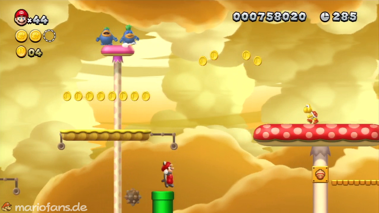 Gehe kurz darauf in die Röhre und sammle dort unten den POW-Block auf. Schmeiß ihn auf die Plattform, wenn die Pilze groß sind, so dass die Sternenmünze auf die Pilz-Plattform fällt.