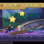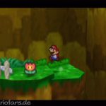 Zerstöre den gelben Block der den Weg versperrt, zuvor kannst du im Baum noch einen Pilz finden. Geh nach rechts oben und spring mit dem Trampolin nach oben, um eine Feuerblume zu erreichen. Im nächsten Abschnitt triffst du dann auf die ersten richtigen Gegner. Besiege sie durch Sprünge oder mit Hammerschlägen. Gumpa erklärt dir dabei immer, welche die beste Taktik ist. Etwas weiter oben führt der Weg wieder zurück. Folge diesem Weg, um einen Sternsplitter zu erhalten, hast du ihn kannst du rechts weiter gehen. Du landest wieder im Dorf, wo du zunächst von Gumbrina für das Zurückbringen von Püppi einen Sternsplitter erhältst. Danach erklärt dir Gumpa, wie du Orden anlegst, nach seiner Lektion musst du den Orden „Power-Sprung“ jedoch erneut anlegen (;.