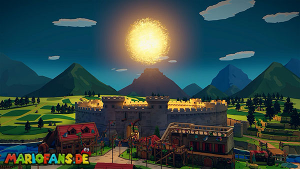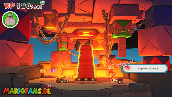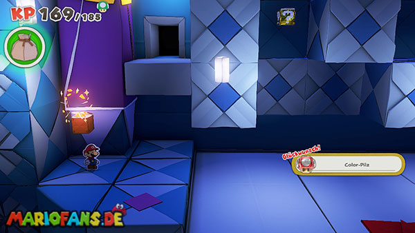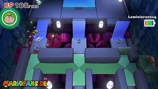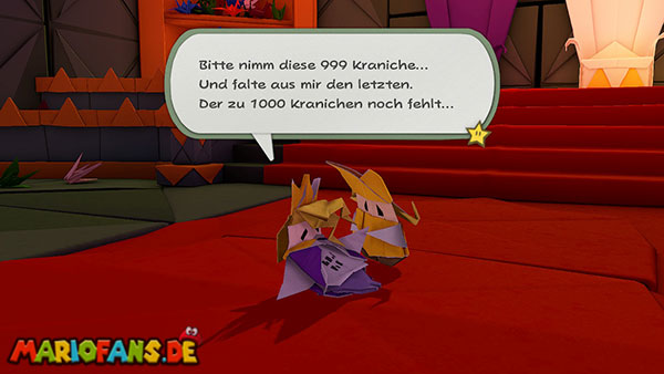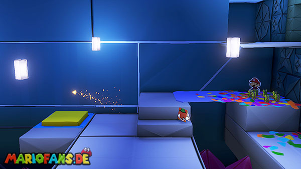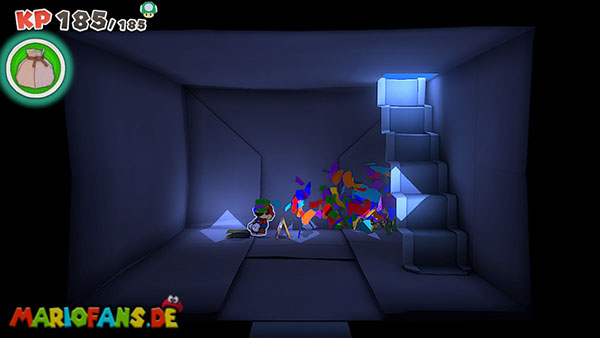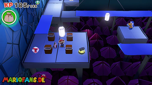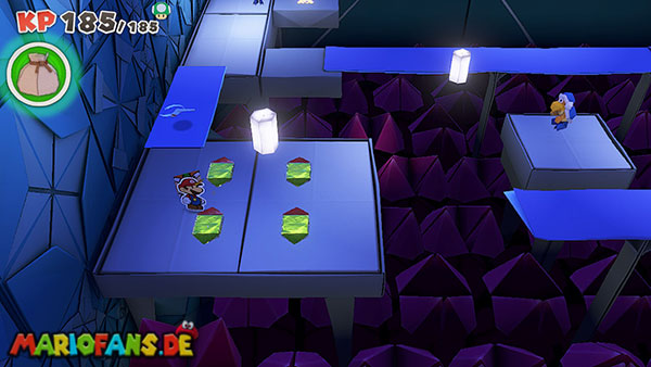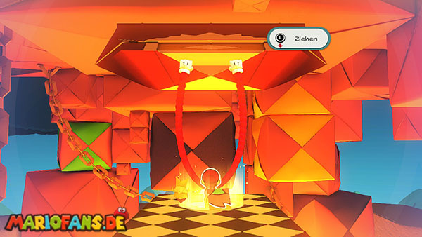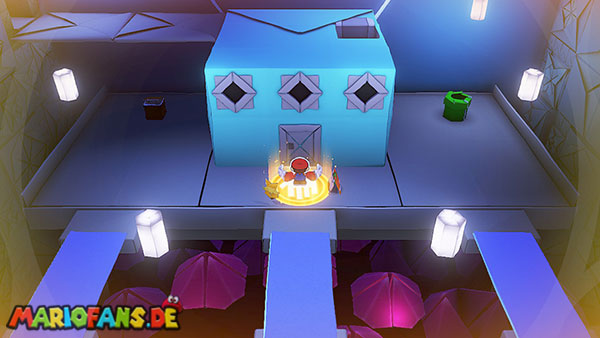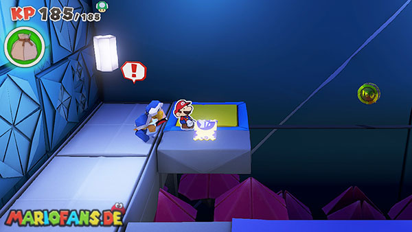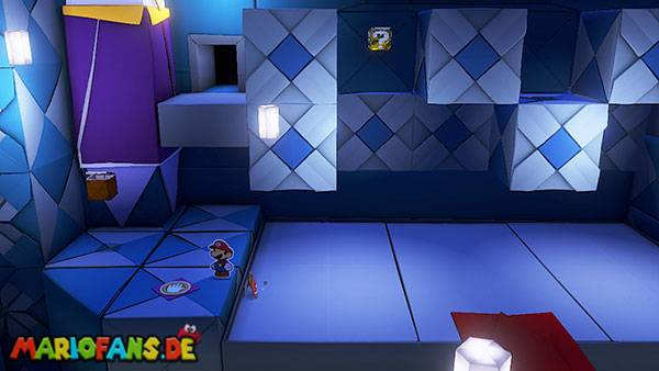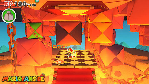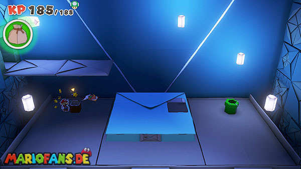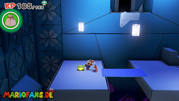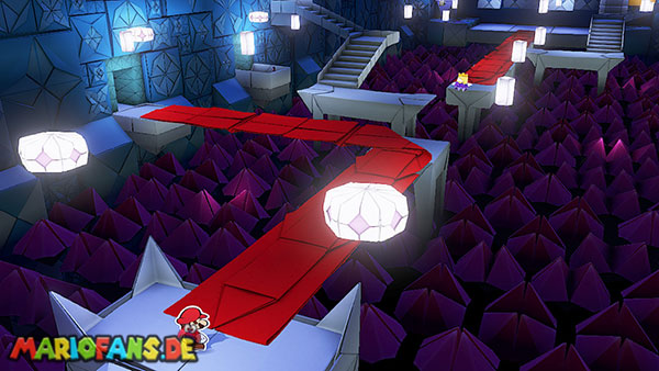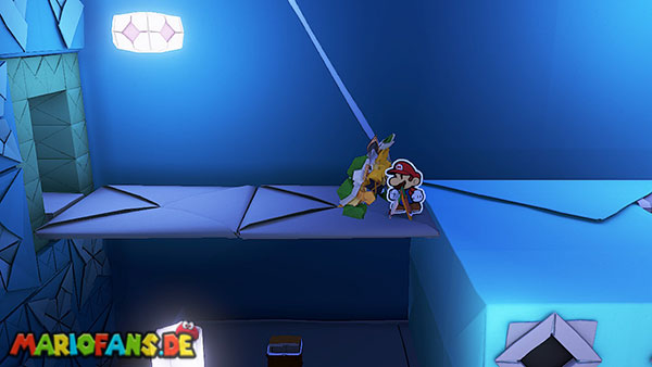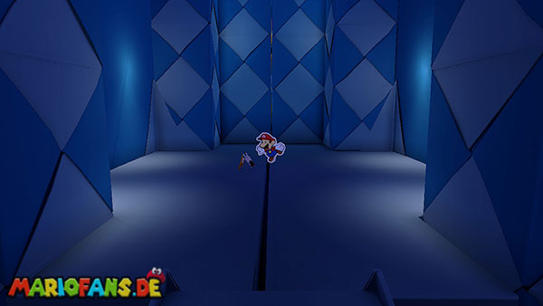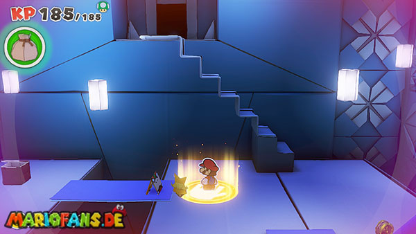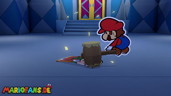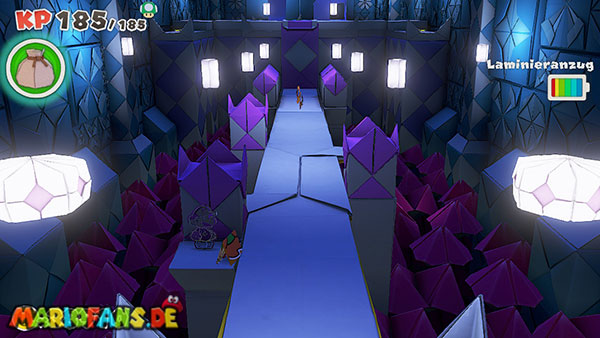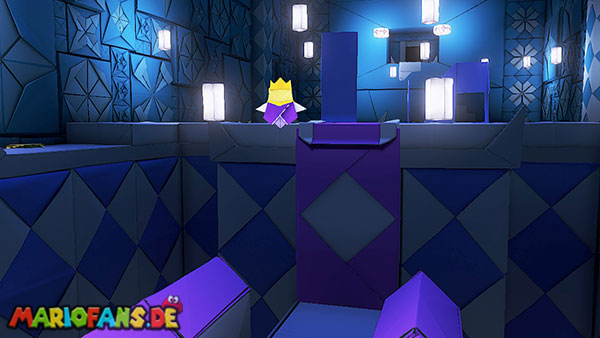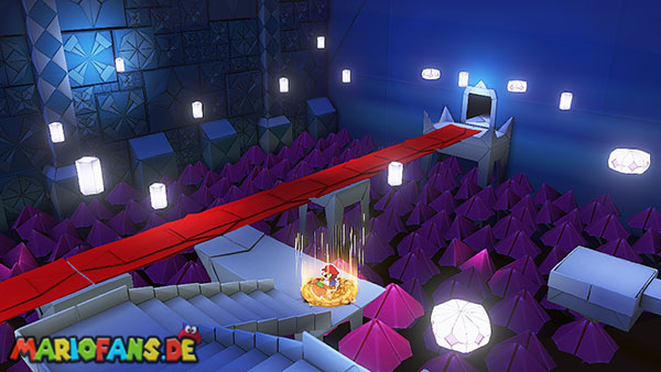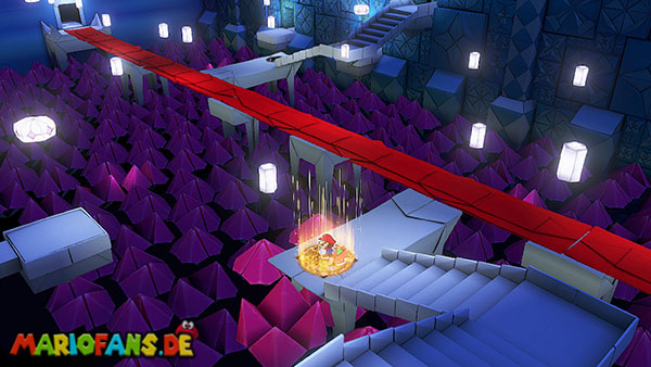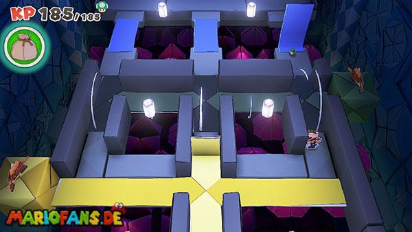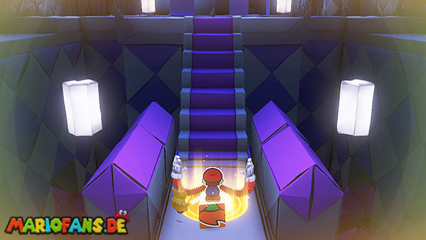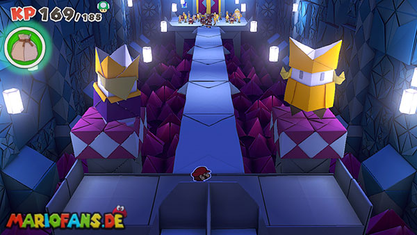 Nachdem ihr das Tor des Pilz-Palasts geöffnet habt, gelangt ihr in die Eingangshalle. Doch kaum seid ihr im Schloss, beginnt Origami-Peach mit der Verwandlung des Gebäudes. Der gesamte Palast verändert seine Struktur und wird zum letzten Dungeon des Spiels: Kastell Knick.