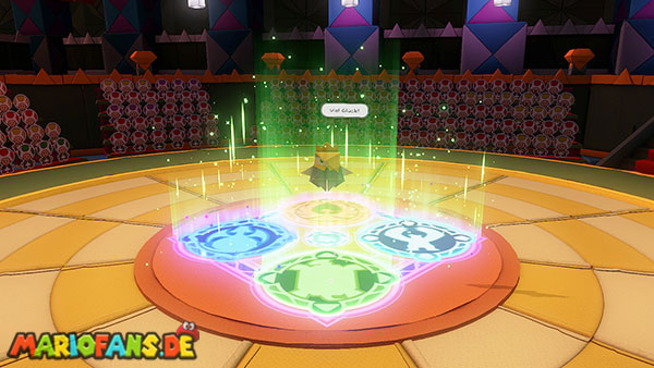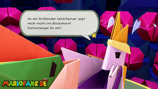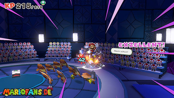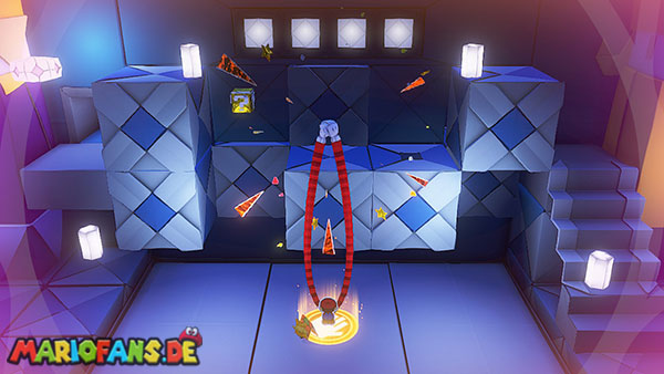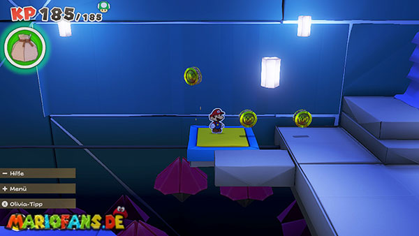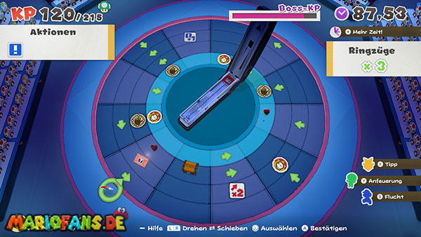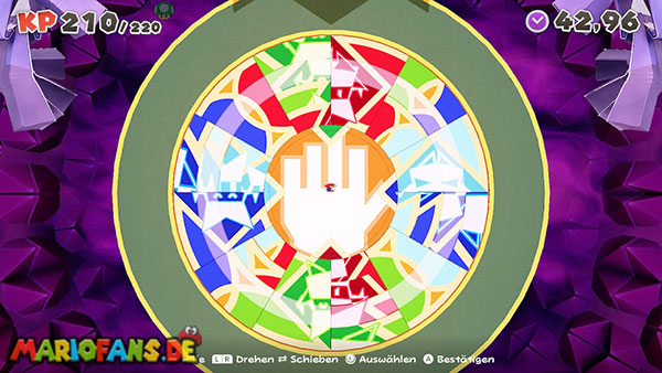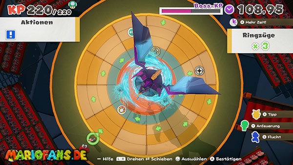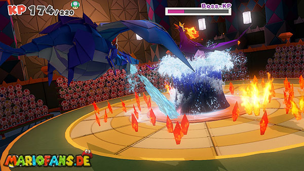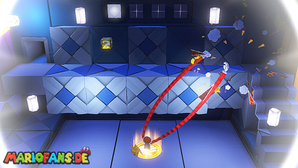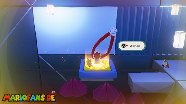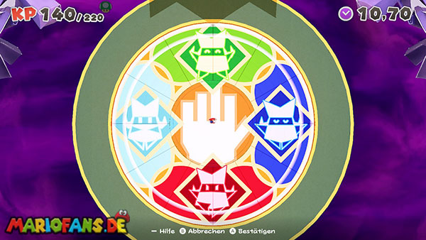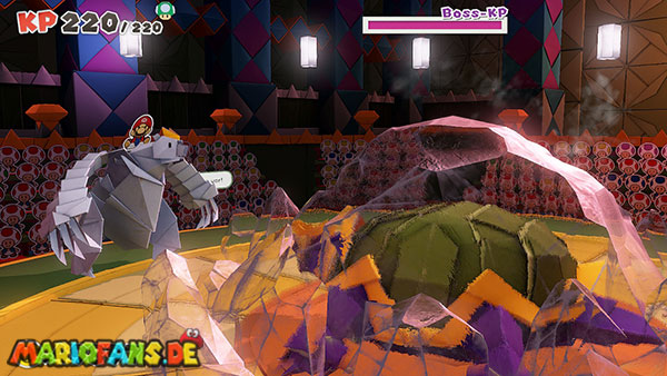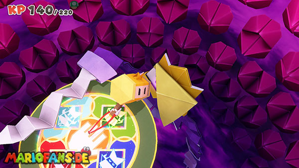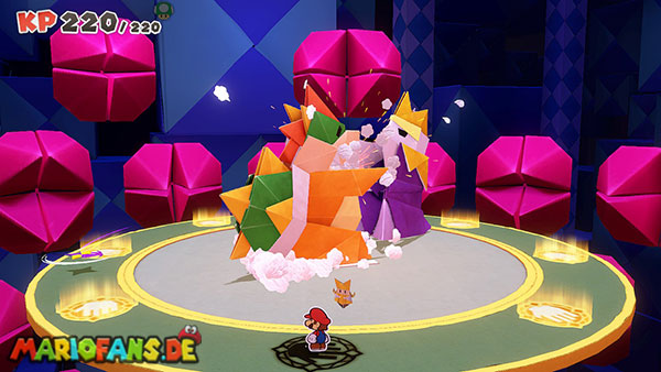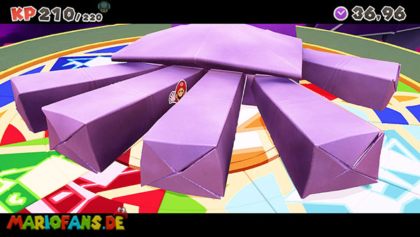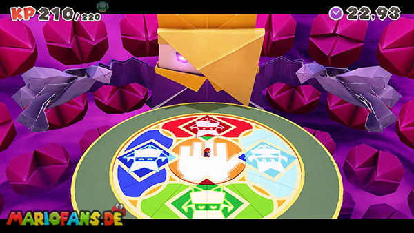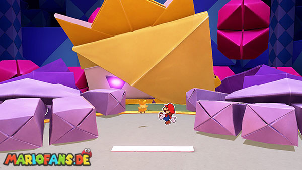 Natürlich versucht Olly weiterhin, euch aufzuhalten. Immer wieder wirft er Origami-Wurfsterne auf Mario, denen ihr ausweichen müsst. Außerdem erscheinen gelegentlich große Hindernisse auf der Arena, die euch den Weg zum Faltkreis blockieren können.