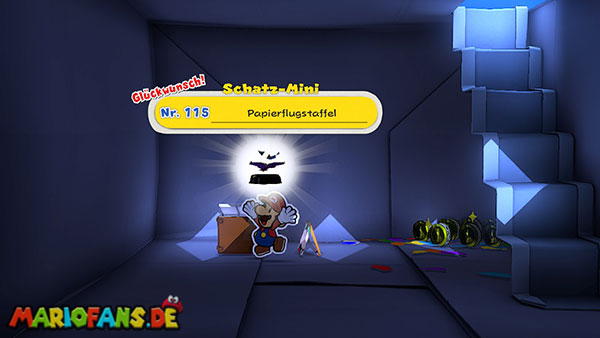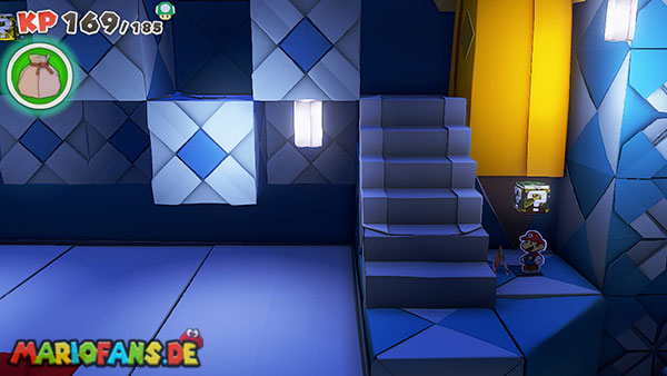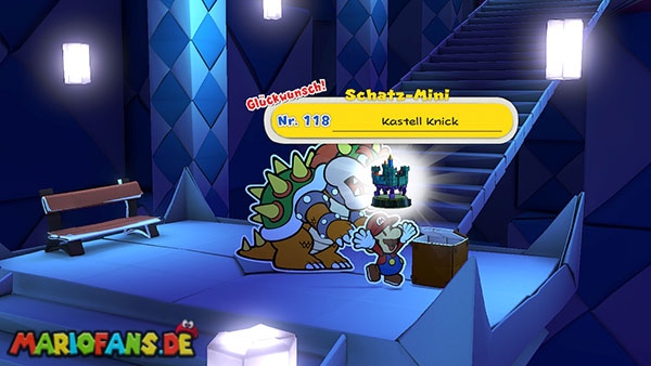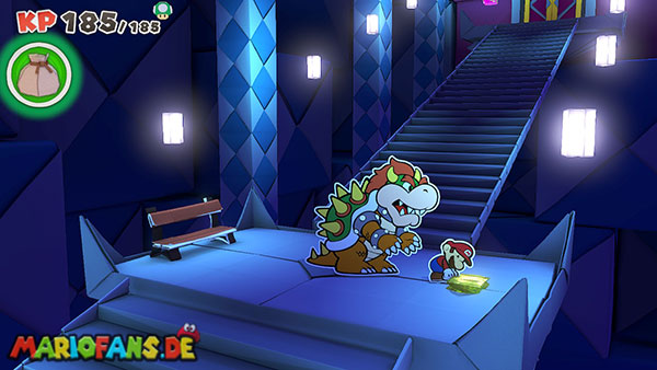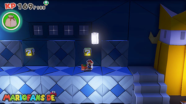Nachdem ihr den Tacker besiegt habt, führt eine letzte Treppe hinauf zum Thronsaal. Bevor ihr durch die große Tür geht, solltet ihr unbedingt noch einmal speichern. Direkt gegenüber von der Bank findet ihr außerdem einen ?-Block mit einem weiteren Schatz-Mini.