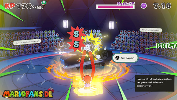 Während Bowser Olly direkt bekämpft, müsst ihr ihn unterstützen. Lauft hinter Bowser zum Faltkreis und nutzt die Faltarme, um auf den Boden zu schlagen. Die entstehenden Schockwellen helfen Bowser dabei, Olly Schritt für Schritt zurückzudrängen.