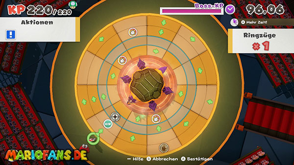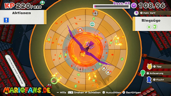 Im letzten Abschnitt des Kampfes müsst ihr außerdem ein großes Ringpuzzle unter Zeitdruck lösen. Zunächst müsst ihr mehrere Felder verschieben und danach die Ringe drehen, bis das Bild vollständig zusammengesetzt ist.