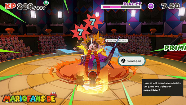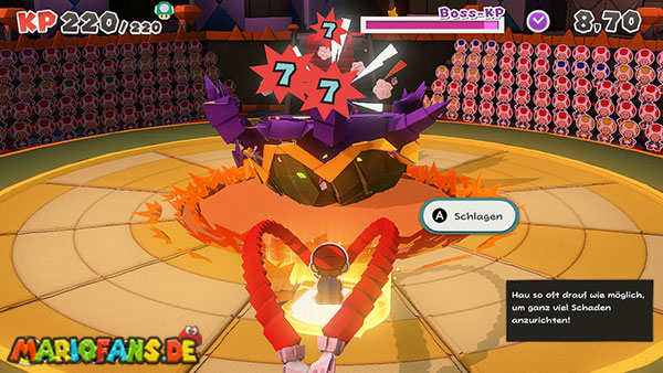 Der Boss greift euch mit Metallklammern an und kann Mario sogar am Boden festtackern. Seine eigentliche Schwachstelle zeigt sich jedoch erst, wenn sein Magazin leer ist.