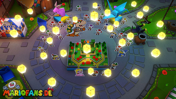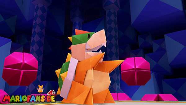 Um gegen diese neue Form bestehen zu können, greift Olivia ein und verwandelt Bowser in eine gigantische Origami-Version seiner selbst. Nun beginnt ein spektakulärer letzter Kampf.