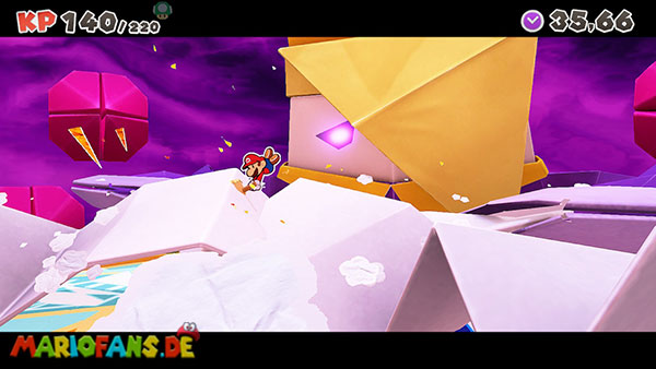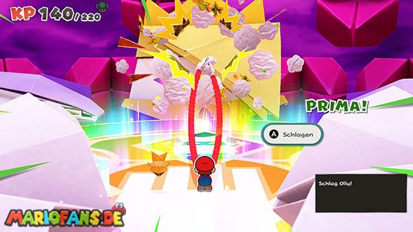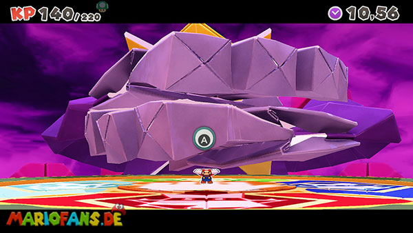 Kurz bevor Olly in den Abgrund stürzt, beschwört er einen riesigen Origami-Felsen über euch. Bleibt deshalb nicht zu lange auf dem Faltkreis stehen und weicht rechtzeitig aus, sonst werdet ihr sofort besiegt.