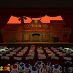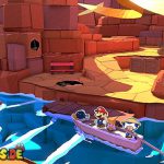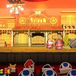 Zerstört die blaue Luftschlange nach eurem Sieg und setzt euch zurück auf euren Platz, um ins Erdgeschoss zu fahren. Bevor ihr das Theater verlasst, solltet ihr auf die Bühne gehen und rechts einen Toad retten bzw. links einen Schatz-Mini #53 einsammeln. Euer nächstes Ziel ist die gelbe Luftschlange. Geht zurück zum Boot außerhalb des Shogunlands und steuert den Krepppapier-Canyon an.
