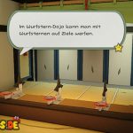 Euer nächstes Ziel ist das Haus der Heimtücke in Ninja-Parcours im Südosten des Shogunlands. Der Weg wird allerdings von einem Kettenhund blockiert, den ihr mit einem Knochen besänftigen könntet. Dank eines Tauschgeschäfts könnt ihr den benötigten Knochen erhalten. Zuerst müsst ihr in das Teehaus gehen, das links vom Kettenhund steht. Schnappt euch den Schatz-Mini hinter dem Shy Guy und redet dann mit dem Shy Guy, um einen Strohhalm zu bekommen.