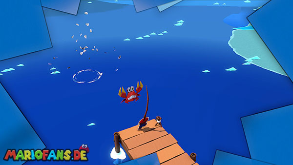 Wenn ihr die Insel erreicht, wirkt sie zunächst nur wie eine Mondsichel. Begebt euch zum Steg im Norden und werft die Angel aus. Zieht die Krabbe aus dem Wasser und besiegt sie im anschließenden Kampf.