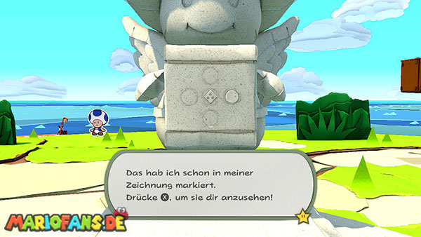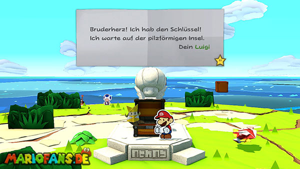 Die Notiz verrät, dass Luigi auf dem Pilz-Eiland im Weiten Ozean auf euch wartet. Dort könnt ihr den Karo-Schlüssel erhalten, der für die Karo-Insel benötigt wird.