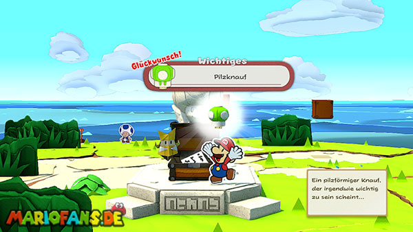 In der Schatztruhe findet ihr zwar nicht den gesuchten Schlüssel, sondern lediglich einen Pilzknauf. Außerdem entdeckt ihr eine Nachricht von Luigi, der den Karo-Schlüssel bereits an sich genommen hat.
