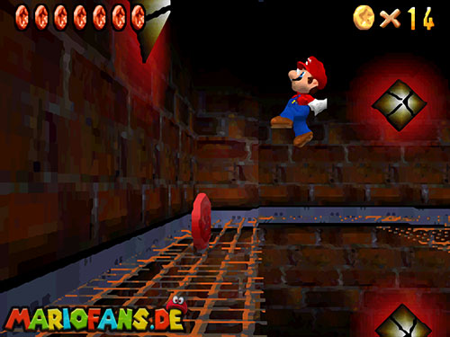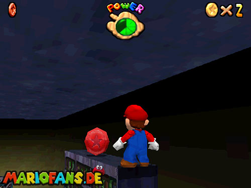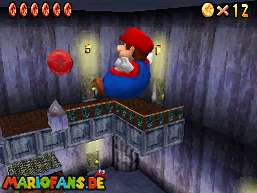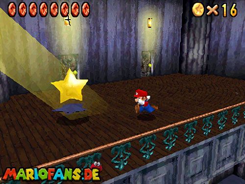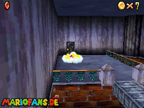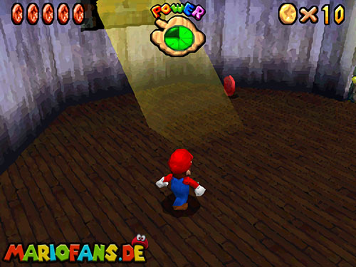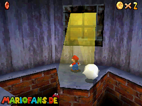 Im zweiten Stockwerk, findet ihr in der dritten Tür von links wieder eine rote Münze, auf einer Art Draht.Verlasst auch diesen Raum, und geht in den dritten Raum von rechts. Dort ist ein riesen Glubschi, im neben Raum sind Särge. Im ersten Sarg von rechts ist eine rote Münzen versteckt. Die vorletzte rote Münze findet ihr im zweiten Raum von rechts, Im Nebenraum hinter einer Falltür, nicht durchfallen! Geht durch die Tür und ihr landet auf einem kleinen Balkon wo ein roter Block mit einer Blume ist. Schweb als Ballon in die Mitte des Raumes und hol dir die letzte Münze. Habt ihr alle acht Münzen, erscheint der Stern im Mondscheinlicht im zweiten Stock.