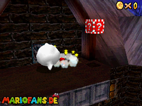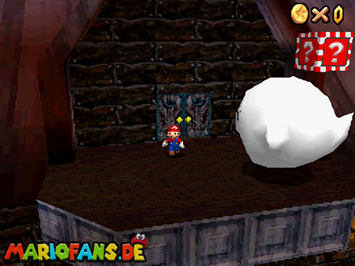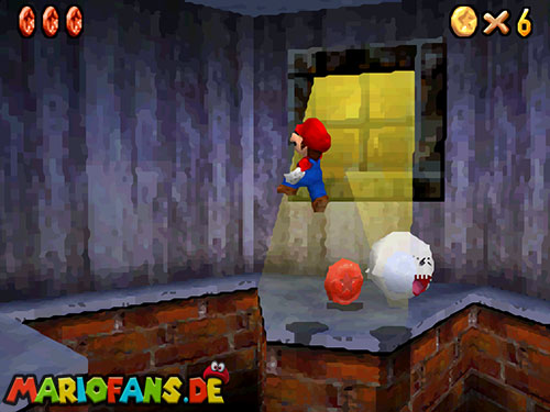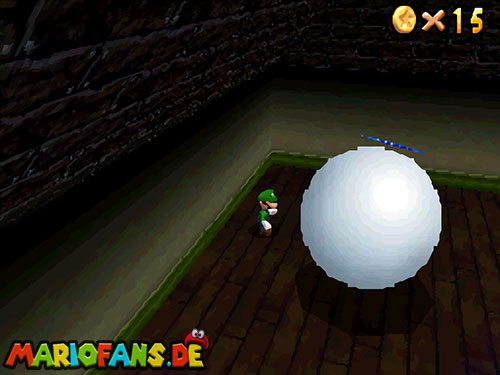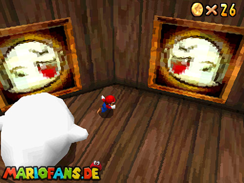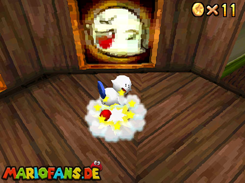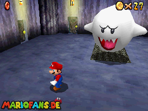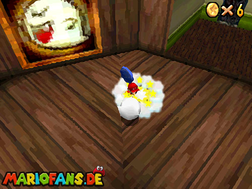 Geht als erstes nach rechts die Hausfassade entlang. Bis ihr eine weitere Tür findet geht hinein, und ihr müsst zwei Boos besiegen, entweder macht ihr eine Stampfattacke oder ihr gebt ihnen ein Schlag ins Gesicht (B). Nach dem besiegen erhaltet ihr zwei blaue Münzen (10 gelbe Münzen). Verlasst wieder den Raum, und geht zurück zum Eingang. Benutzt die Tür vom Schloss, und betretet dann die dritte Tür von links, in diesem Raum erwartet euch ein Glubschi und ein Buu Huu. Besiegt wieder den Buu Huu und verlasst den Raum. Jetzt betretet den ersten Raum von rechts. Dort ist wieder ein Geist zu besiegen, habt ihr das erledigt betretet den nächsten Raum und besiegt auch den letzten kleinen Buu Huu. Habt ihr alle Geister besiegt geht wieder zur Eingangshalle. Dort erwartet euch der „große Bruder“ Big Buu. Mit drei Schlägen ist aber auch der besiegt. Eine Treppe erscheint, und ihr könnt euch den Stern schnappen.