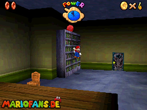 Geht ins Haus, benutzt die Treppe um in den zweiten Stock zu gelangen. Oben, geht in die zweite Tür von links. Dieser Raum ist die Bücherei. Aus den Regalen kommen Bücher geflogen dort gilt es geschickt auszuweichen, am besten macht ihr einen Weitsprung. Im nächsten Regal befindet sich dann das Rätsel. Zuerst müsst ihr das Buch in der Mitte berühren, als nächstes das rechts und zum Schluss das links. Berührt ihr das falsche Buch; Schalter schießt ein Buch aus dem Regal. Wurde das Rätsel richtig gelöst, verschiebt sich die Wand und gibt eine neue Tür frei. Geht durch diese und schnappt euch den Stern.
