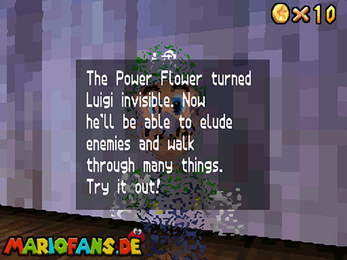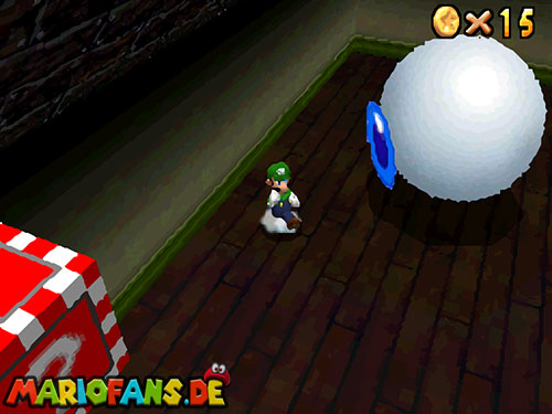 Hol dir von der Rückseite des Schlosses die Kappe von Luigi und gehe anschließend auf Big Boos Balkon. Mit einem Rückwärtssalto kann Luigi höher springen und so die obere Tür erreichen. Mit einer Blume ist es möglich durch das Gemälde zu gehen. Lauf nun immer wieder im Kreis bis das Auge verschwindet der Stern erscheint.