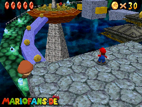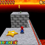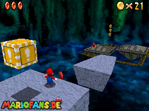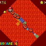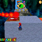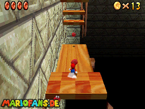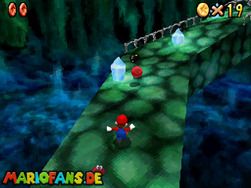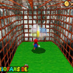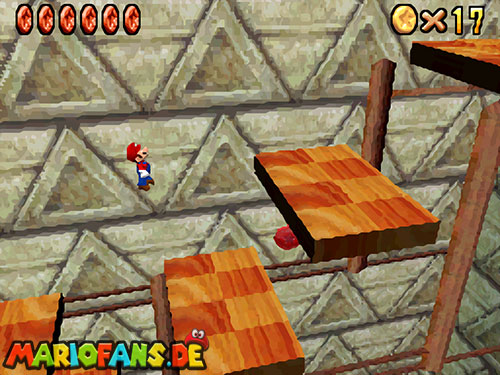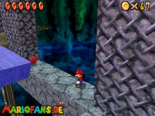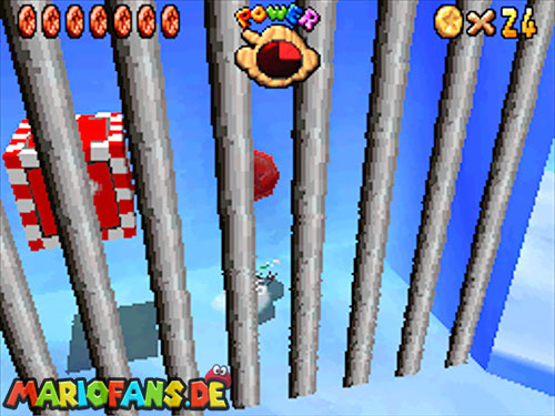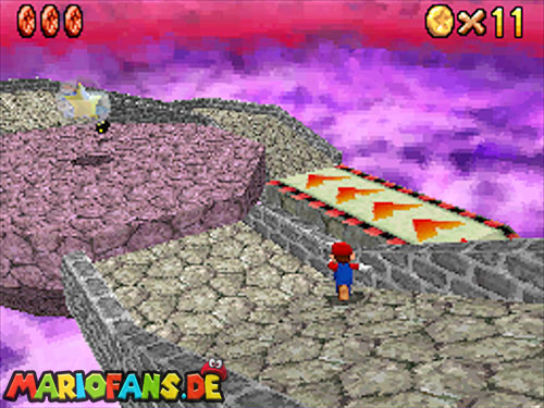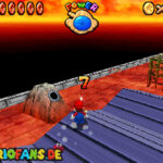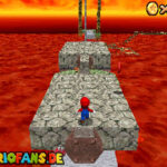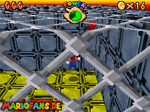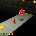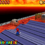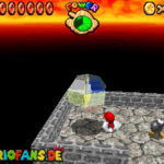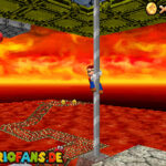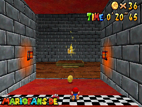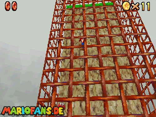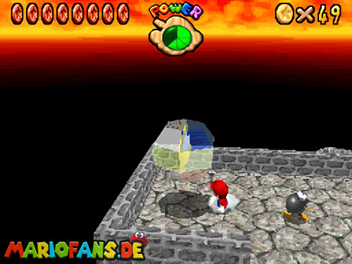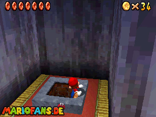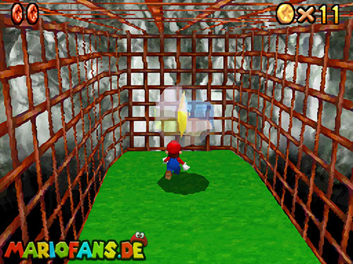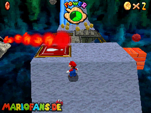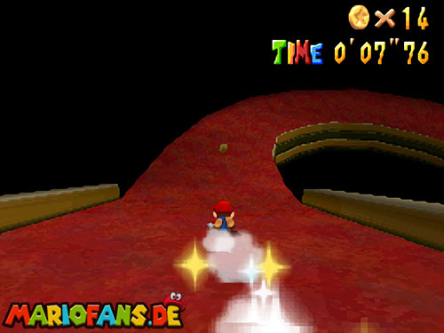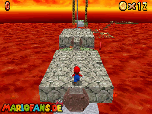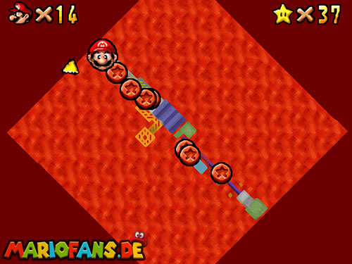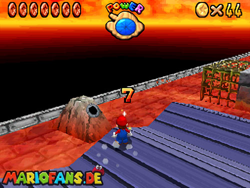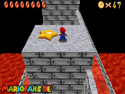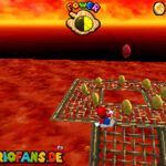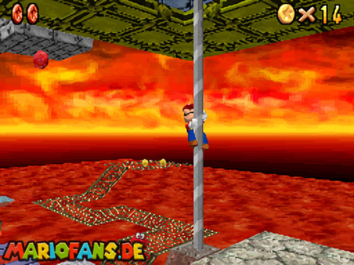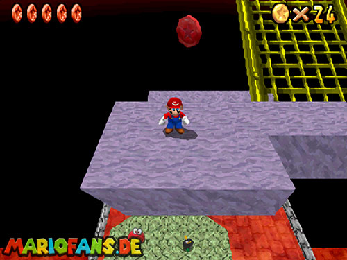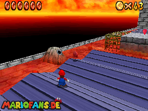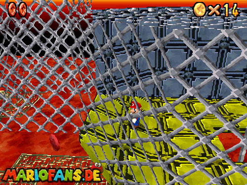 Im Keller findet ihr dieses Level. Nach dem Start müsst ihr auf das Gitter gehen und über den ersten Abschnitt vom Lavasee fahren. Am besten holt ihr euch noch das Leben links. Klettert nun das nächste Gitter links nach oben, dort findet ihr die erste rote Münze (1).Geht nun zur Stange und springt nach oben, auf der wackligen Plattform ist eine weitere roten Münze (2). Wenn ihr dann im Käfig seid, findet ihr in der oberen Ecke noch eine rote Münze (3). Steigt jetzt auf die Plattform, wenn sie sich nach oben bewegt geht wieder runter und springt in das Loch, denn dort befindet sich Münze Nummer vier (4). Jetzt müsst ihr wieder in den Käfig diesmal aber mit der Plattform nach oben fahren. Oben angekommen müsst ihr beim ersten steilen Berg rechts hochgehen, dort wo der Bully ist, denn hier versteckt sich eine weitere rote Münze (5). Geht nun die „Treppe“ nach oben, wenn der Weg ganz steil ist könnt ihr auf der dritten Etage noch eine rote Münze finden (6). Ganz oben ist bei den schwimmenden Plattform Münze sieben zu ergattern, Vorsicht ein Feuerstrahl behindert euch ein wenig. An der letzten Stange ist auch die letzte Münze zu finden, der Stern erscheint dann ein wenig höher. Mit einem Rückwärtssalto gegen die schmale Wand sollte der Stern gut zu erreichen sein.