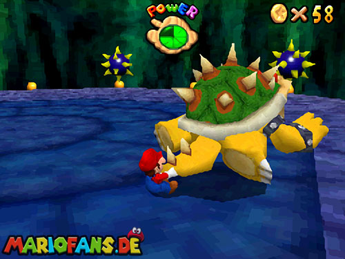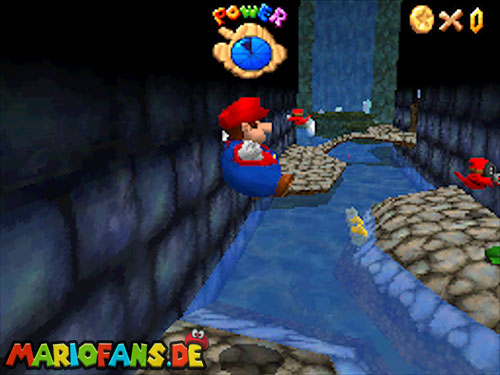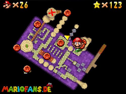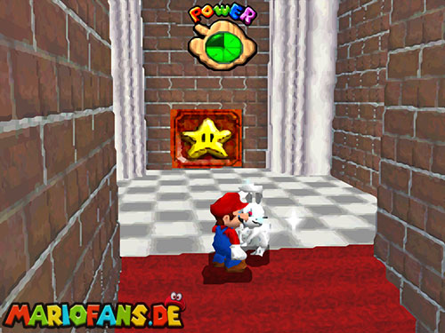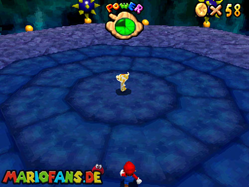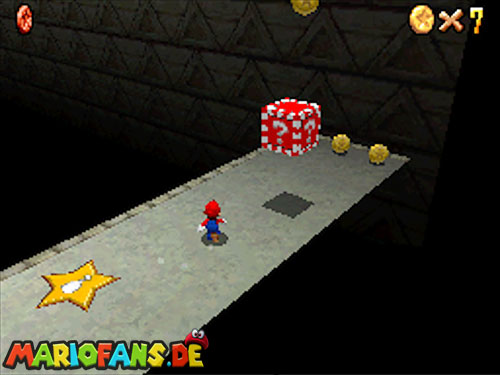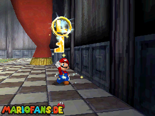 Im EG oben links. Wenn ihr in der Welt seid, geht geradeaus, und aktiviert den !-Schalter, er lässt Blöcke erscheinen, wo sich rote Münzen befinden. Die erste rote Münze befindet sich am Eingang auf einen Block, rechts. Die zweite findet ihr in der nähe vom Schalter. Benutzt die fahrenden Plattformen, um auf die andere Seite zu kommen. Es geht auch mit einen Weitsprung (Z+A). Benutzt auch einen Weitsprung um an der blauen Wand hoch zu klettern. Schafft ihr es nicht, geht lieber aussen rum. Ein Karusselll bringt euch zur nächsten großen Plattform, wo sich Gumbas und ein extra Leben befinden. Geht über die Brücke zum nächsten Feld. Bei den Elektro-Monstern ist auch eine rote Münze hinter einen Kristall versteckt. Geht den Weg weiter, mit dem Schiebebalken gelangt ihr wieder auf eine Plattform, auf dem Schiebebalken befindet sich hinter der Plattform noch eine rote Münze. Geht zu den sich bewegenden Plattformen und sammelt auch da die rote Münze ein. Seid ihr beim Gumba dreht die Kamera so (C-Stick), das ihr einen Weg zu einer abgelegenen Plattform seht, und geht ihn lang. Auf der Plattform befindet sich noch eine rote Münze und ein extra Leben. Geht wieder zurück und benutzt diese Art Waagen um fortzuschreiten. Links in der Seite seht ihr noch eine rote Münze. Klettert nun die beiden Balken nach oben und schaut nach links, dort ist noch ein Weg, springt ihn entlang (Z+A) und ihr findet die letzt rote Münze. Aktiviert nun den Schalter und eine Treppe erscheint, die euch zum Stern und Bowser führt. Ihr besiegt Bowser, indem ihr ihn am Schwanz packt (B) und dann im Kreis dreht (Controller Stick drehen). Danach müsst ihr ihn noch gegen eine Bombe werfen (B). Nach dem besiegen erhaltet ihr den Schlüssel für den Keller.