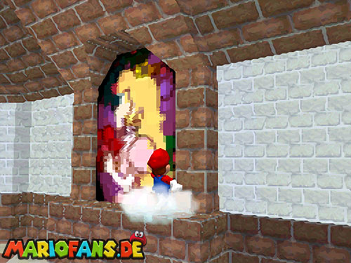 Sucht im EG oben rechts die Tür auf. Im Raum sind drei Gemälde von Peach, springt in das rechte rein ;).