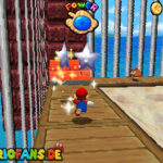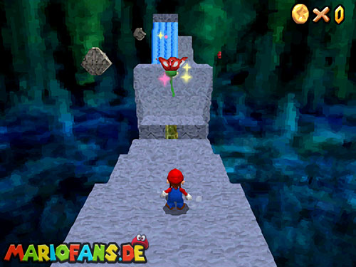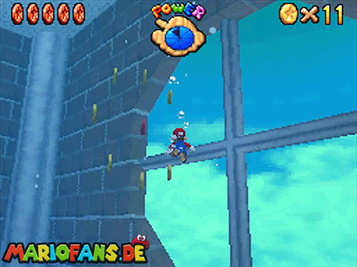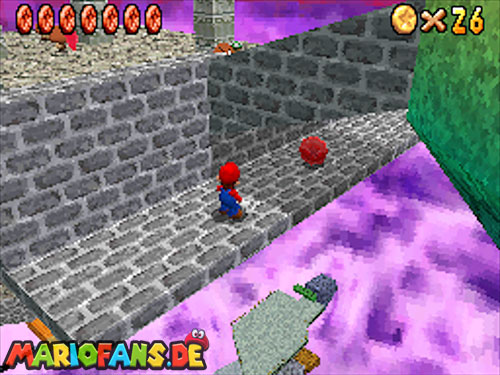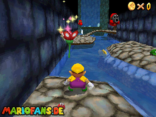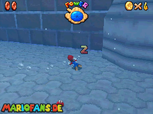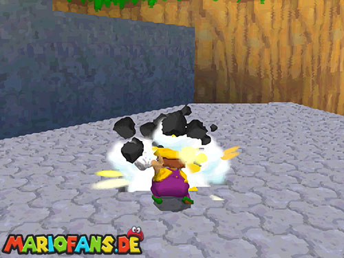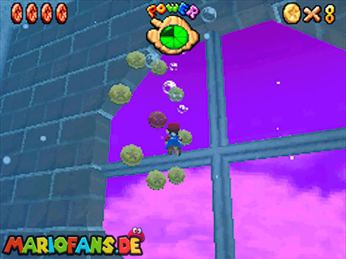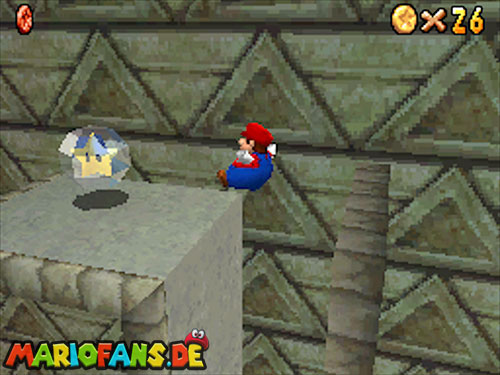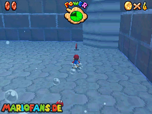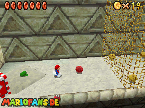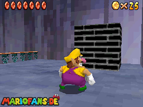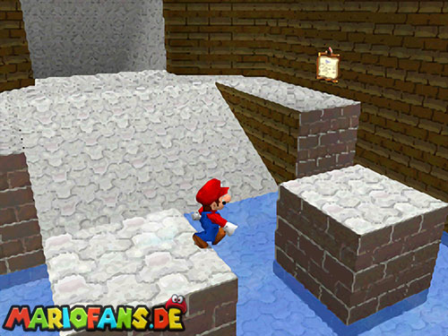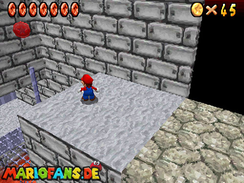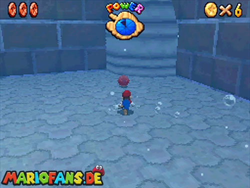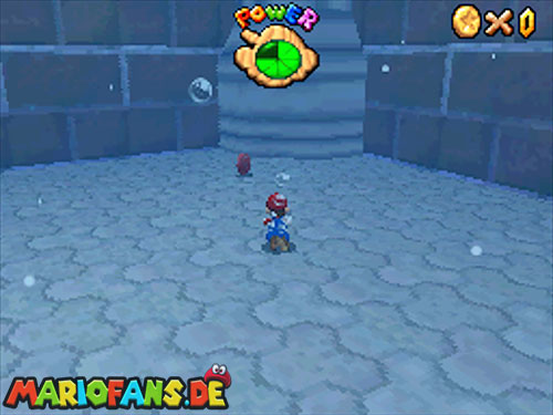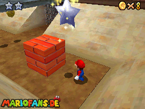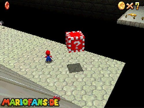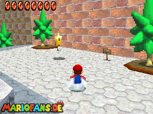 Im Hinterhof des Schlosses gibt es einige rote Blöcke, die ihr mittels Stampfattacke zerstören könnt. Dort drunter befindet sich ein Loch, welches zu einem Minilevel führt. Sammelt hier alle 5 Silbersterne ,ein um den nächsten, geheimen Schlossstern zu finden.