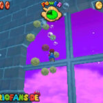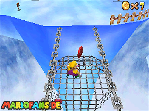 Nachdem du die Rutsche zu Beginn genommen hast, läufst du nach rechts weiter. Du wirst einen Hügel sehen, an dem man hochklettern kann. Danach befindet sich ein Sternenschalter auf einer langen Plattform . Drückt diesen und ein Stern hoch oben in einem Käfig erscheint. Lauft zu dieser Stelle und nutzt Marios Wandsprung, um den den Stern zu erreichen.