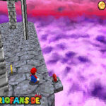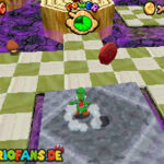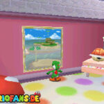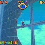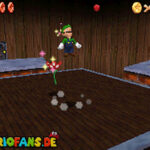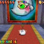 Zunächst geht es im Foyer durch die Holztür. Nachdem du Bowser das erste Mal besiegt hast, ist ein Riesen Buu-Huu dort und führt dich in den Innenhof. Such links einen Buu Huu, welcher ein Karusell verschluckt hat. Besiege diesen mit einer Stampfattacke oder einen Schlag und spring dann in die Welt „Big Boos Burg„. Hier musst du zunächst die erste Mission gemeistert haben, damit die Treppe vorhanden ist. Danach gehst du oben rechts durch die Tür und holst dir eine Blume. Mit dieser kannst du nach oben schweben und eine weitere Tür finden. Dahinter siehst du schon das Gemälde von Luigi, welches du betreten musst.