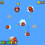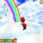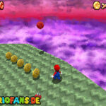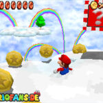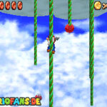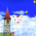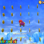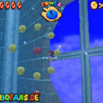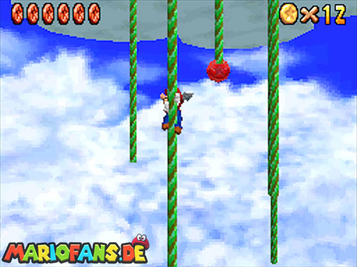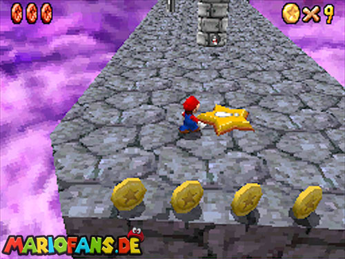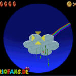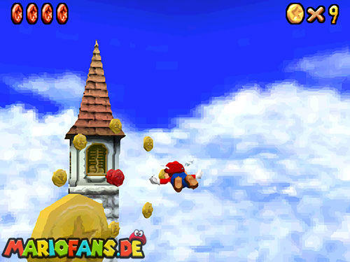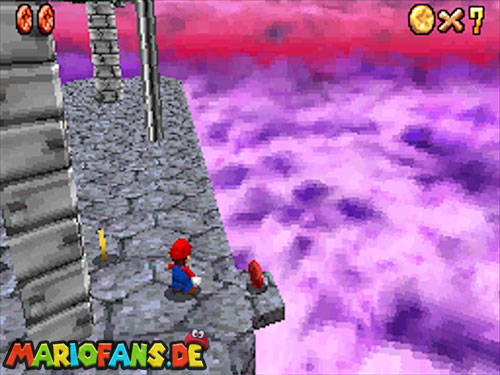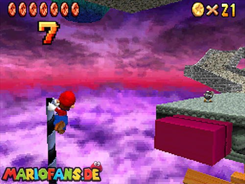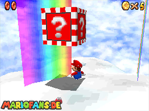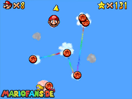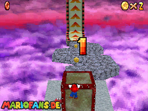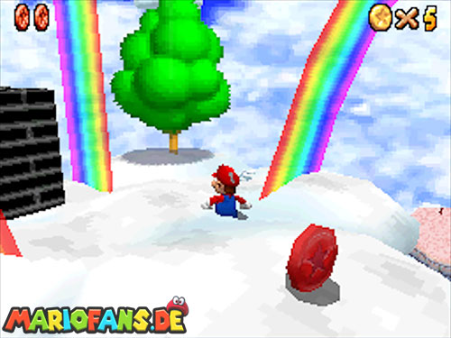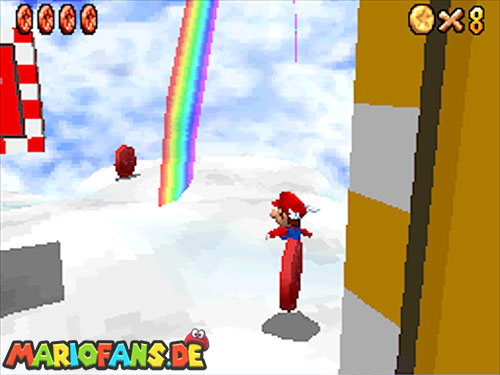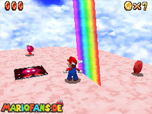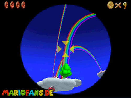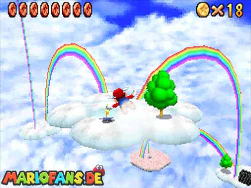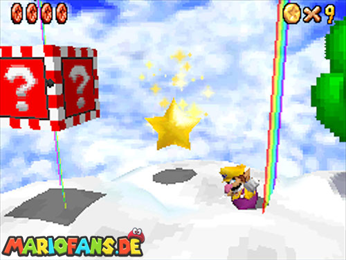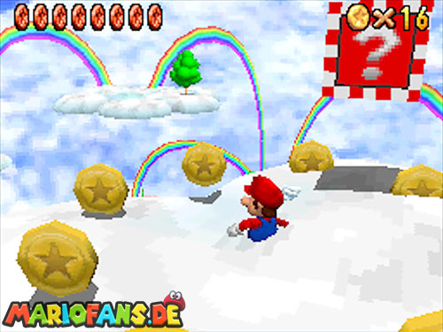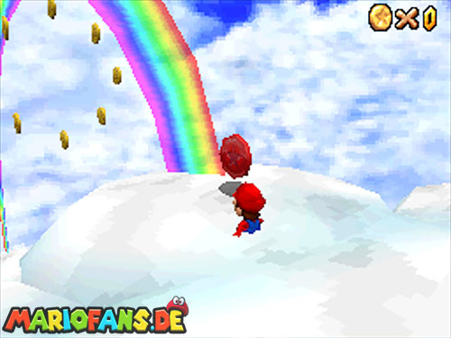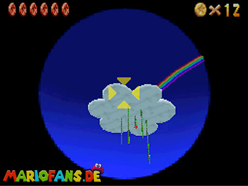 In der Welt schnappt ihr euch hinter euch die erste Münze (1). Schnappt euch nun eine Federkappe und fliegt nach ganz unten auf eine pinke Plattform wo eine Stange steht. Denn dort findet ihr neben einer roten Münze (2) auch einen Bob-omb, der die Kanone öffnet. Zielt mit dieser auf die nächste pinke Plattform und geht dort erneut in die Kanone sucht jetzt die Wolke wo Stangen rausschauen. Fliegt auf diese Wolke und holt Münze 3 und 4. Fliegt nun unter die Wolke und holt auch die Münze, welche bei den Stangen ist (5). Landet auf der Wolke unter den Stangen, holt eine neue Mütze und fliegt jetzt zu einer ganz kleinen Wolke, dort landen auch zwei Regenbögen. Hier ist Münze 6. Zwischen den beiden Kanonen-Inseln ist auch eine Wolke, fliegt dort hin und schnappt euch Münze 7. Zum Schluss schießt ihr euch wieder zu der höchsten Wolke und fliegt von dort in eine graue Wolke in der die letzte Münze steckt. Jetzt könnt ihr euch den Stern von der Anfangswolke holen.