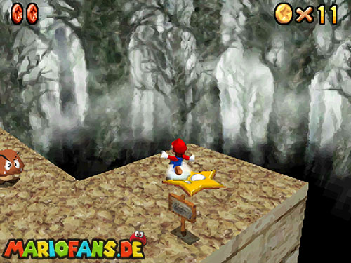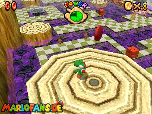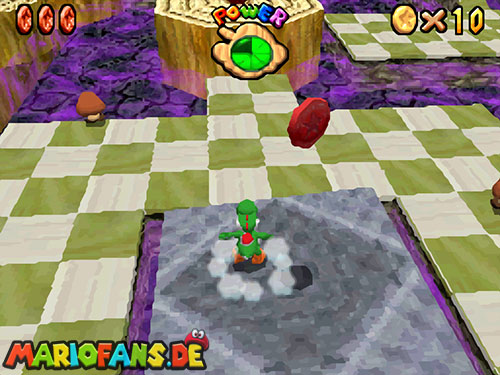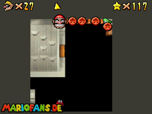 - 8. Als Luigi werdet ihr unsichtbar. Nun rennt um den Baumstumpf mit dem roten Bob-omb. Ein Rückwärtssalto zur höheren Ebene und durch das Gitter ist nötig, um die letzte Münze zu erhalten.