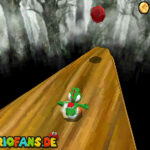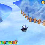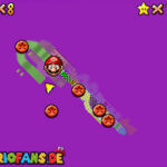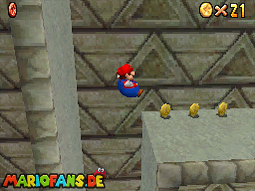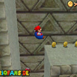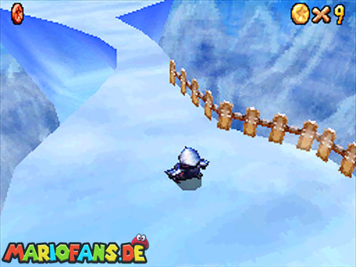Aktiviert rechts den blauen Schalter mit einer Stampfattacke (A+Z). Lauft dann schnell auf die Rutschbahn, und sammelt die blauen Münzen ein. Folgt danach einfach nur den gelben Münzen zum Ziel, unterwegs könnt ihr noch ein extra Leben einsammeln, und am Ziel auch. Schafft ihr die Bahn, dann wartet ein Stern.