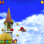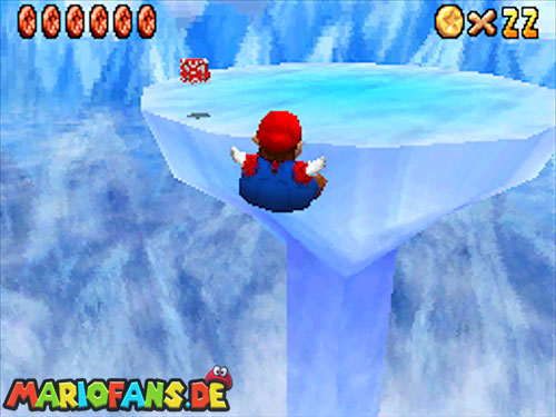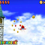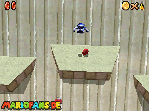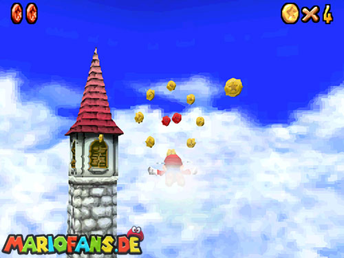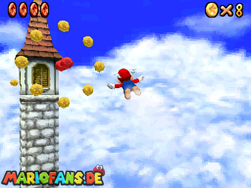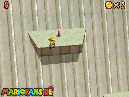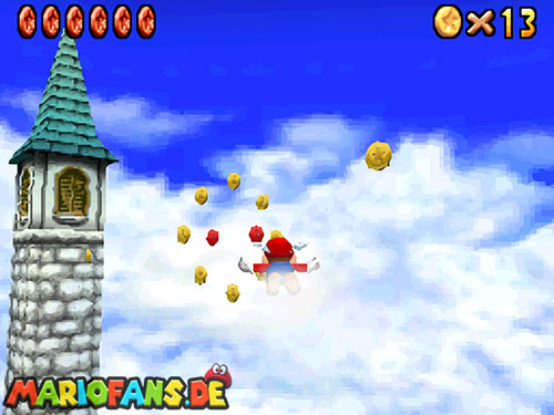 Nachdem ihr ins Licht geschaut habt, fallt ihr ins Level. Dort erhaltet ihr beim ersten Mal einen kleinen Dialog, wie ihr das Fliegen später startet (Dreisprung; dreimal A). Wenn ihr den Dialog beendet habt, folgt den gelben Münzen, sie führen euch zu den acht roten Münzen, diese sind zu zweit in Münzringen. Dabei ist die Münzbahn wie eine herabfallende Spirale angeordnet. Je weiter ihr runterfliegt desto schneller werdet ihr. Deswegen ist die Aufgabe alle acht rote Münzen einzusammeln nicht ganz leicht. In der Mitte befindet sich ein Turm, dort müsst ihr den roten Schalter betätigen, danach findet ihr in den roten Blöcken immer eine Federkappe.