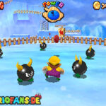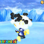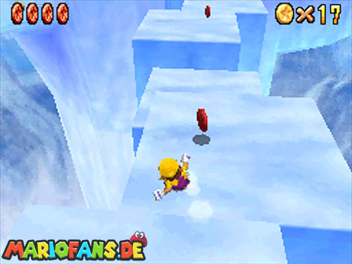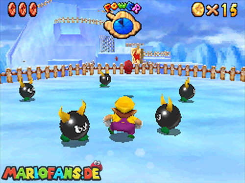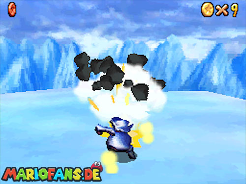 Nach der Eisrutsche folgst du dem Weg weiter über die Plattformen. Spring nun von Eisblock zu Eisblock bist du oben an einem Loch ankommst. Hier wartet der König Eis-Bully auf dich. Schlag ihn vom Eis, pass aber auf das du selbst nicht runter fällst. Nach jedem Treffer wird die Plattform kleiner. Wiederhole das ganze dreimal um auch den Schlüssel für Warios Tür zu erhalten.