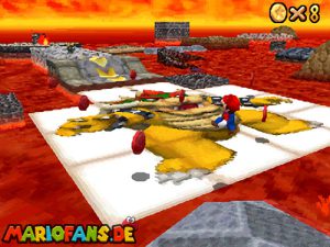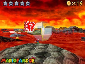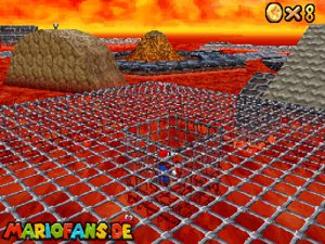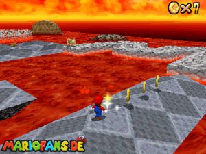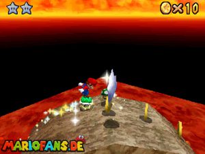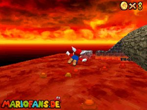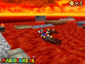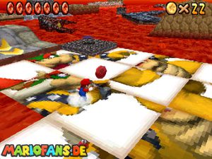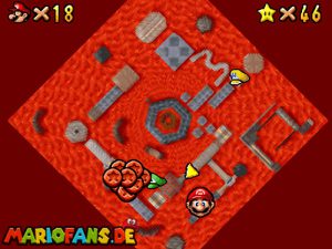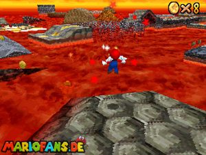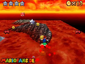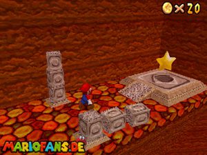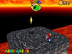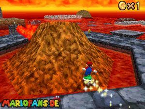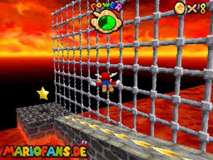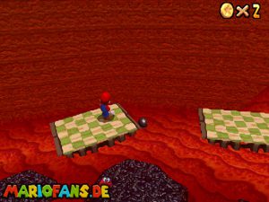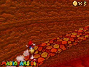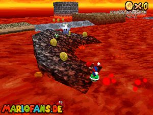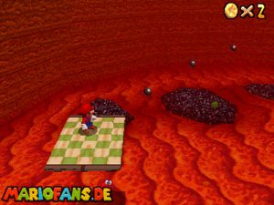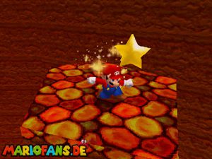 Geht wieder geradeaus und durch das Tor. Schlagt den Bully in die Lava und geht diesmal nach rechts. Ihr müsst auf die schwankenden Plattformen springen und dann rechts auf die Plattform die überschwemmt wird. Geht zu den Bullys und schlagt sie in die Lava. Auf einer Seite der Plattform wo die Bullys sind ist ein Gitter, springt auf dieses und es transportiert euch bis zum Baumstamm. Achtet bei eurer fahrt darauf das ihr nicht von den Lava Fontänen getroffen werdet. Nun müsst ihr auf den Baumstamm springen und auf ihm laufen, „tanzen“. Am Ende der rollenden Strecke wartet ein Power-Stern. Dieser ist aber auch leicht mit der Federkappe zu erreichen.