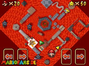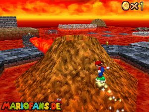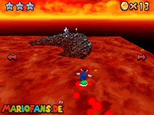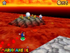 Nachdem ihr in die Welt gesprungen seid, geht den Weg entlang und durch das Tor. Achtet auf die Lava die manchmal herausspringt. Geht die Treppe hoch und schlagt den Bully in die Lava (B). Nun müsst ihr nach links am Glubschi vorbei. Dann kommt ihr auf eine Plattform die immer ein wenig von der Lava überschwemmt wird. Fallt ihr in die Laval verliert ihr drei Lebenspunkte, und Mario springt hoch in die Luft. Überquert die Plattform und lasst das Bowser Puzzle hinter euch. Schlagt auch diese beiden Bullys in die Lava. Geht auf das Flammenrad und springt rechts auf die Holzbalken. Ihr müsst noch eine Plattform überqueren und dann seid ihr bei Big Bully. Diesen besiegt ihr am leichtesten mit dem Sprungkick (A + B). Wenn er in die Lava gefallen ist erscheint der Power-Stern. Einfacher ist es, wenn ihr den Glubschi besiegt in das Loch fallt und auf einer neuen Plattform landet. Holt euch die Feder und fliegt zum Bully.