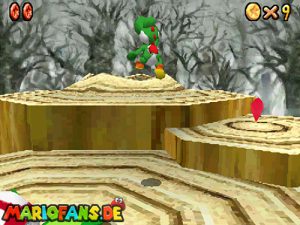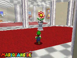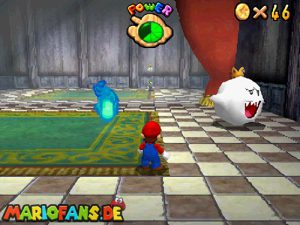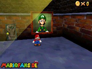 Zunächst geht es im Foyer durch die Holztür. Nachdem du Bowser das erste Mal besiegt hast, ist ein Riesen Buu-Huu dort und führt dich in den Innenhof. Such links einen Buu Huu, welcher ein Karusell verschluckt hat. Besiege diesen mit einer Stampfattacke oder einen Schlag und spring dann in die Welt „Big Boos Burg„. Hier musst du zunächst die erste Mission gemeistert haben, damit die Treppe vorhanden ist. Danach gehst du oben rechts durch die Tür und holst dir eine Blume. Mit dieser kannst du nach oben schweben und eine weitere Tür finden. Dahinter siehst du schon das Gemälde von Luigi, welches du betreten musst.