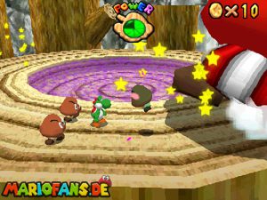 Hast du die Welt betreten musst du zunächst nach hinten links auf den Baumstamm. Kletter die Pflanze nach oben und folge dann den Weg oben weiter bis zum nächsten Baumstamm (auf der Karte dort wo das X ist). Spring in das Loch und du hast König Gumba gefunden. Schluck mit deiner Zunge einen Gumba und spuck ihn weiter auf den König. Wiederhole das ganze dreimal, damit er besiegt ist und den Schlüssel für Marios Tür fallen lässt. Danach kannst du in der Tür mit dem M den Charakter zu Mario wechseln.