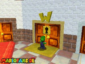 Als erstes nimmst du die rechte Tür, dann die linke Tür. Danach wieder die rechte und dann wieder die linke Tür. Lauf nun schnell über die Brücke und nimm die Plattformen nach oben. Spring in das Loch und du bist in einem Spiegelkabinett. Warte bis Big Boo die Seite wechselt und du ihn aktiv siehst. Mit Schlägen oder Stampfattacken kannst du ihm Schaden zufügen. Wiederhole das ganze dreimal um den Schlüssel für Luigis Tür zu erhalten.