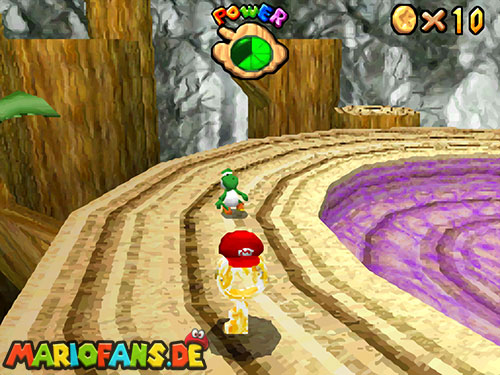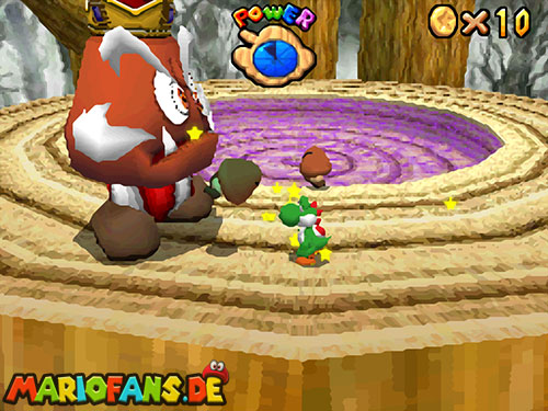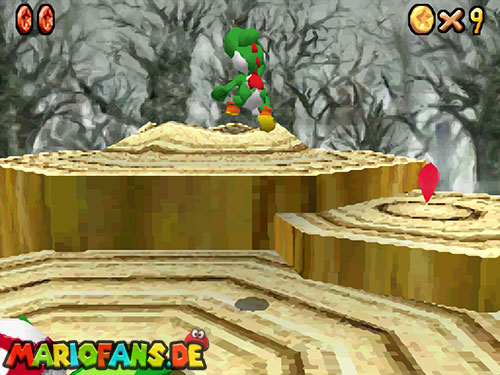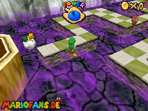 Hast du die Welt betreten musst du zunächst nach hinten links auf den Baumstamm. Kletter die Pflanze nach oben und folge dann den Weg oben weiter bis zum nächsten Baumstamm (auf der Karte dort wo das X ist). Spring in das Loch und du hast König Gumba gefunden. Schluck mit deiner Zunge einen Gumba und spuck ihn weiter auf den König. Wiederhole das ganze dreimal, damit er besiegt ist und den Schlüssel für Marios Tür fallen lässt. Danach kannst du in der Tür mit dem M den Charakter zu Mario wechseln.