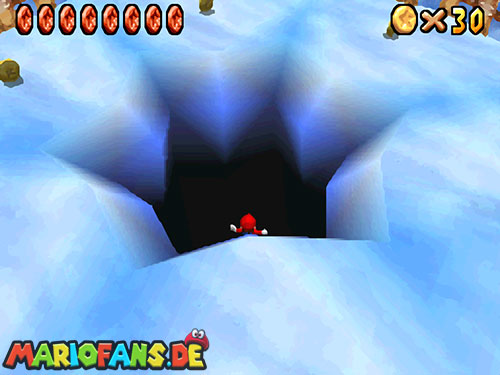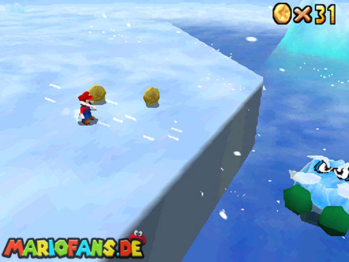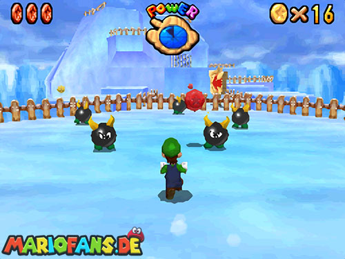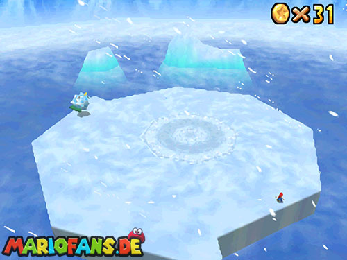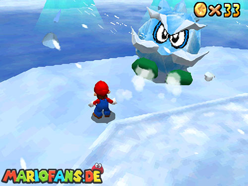 Nach der Eisrutsche folgst du dem Weg weiter über die Plattformen. Spring nun von Eisblock zu Eisblock bist du oben an einem Loch ankommst. Hier wartet der König Eis-Bully auf dich. Schlag ihn vom Eis, pass aber auf das du selbst nicht runter fällst. Nach jedem Treffer wird die Plattform kleiner. Wiederhole das ganze dreimal um auch den Schlüssel für Warios Tür zu erhalten.